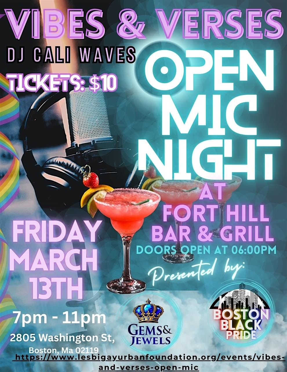 Kick off your night with an evening of rhythm, poetry, and music at Fort Hill Bar & Grill! Join us from 7 PM – 11 PM for a night of open mic experience, brought to you in partnership with Gems & Jewels. This is the official pregame to our Boston Black Pride Welcome to Boston Open Mic event a perfect night to share your voice, vibe with the community, and set the tone for an unforgettable event