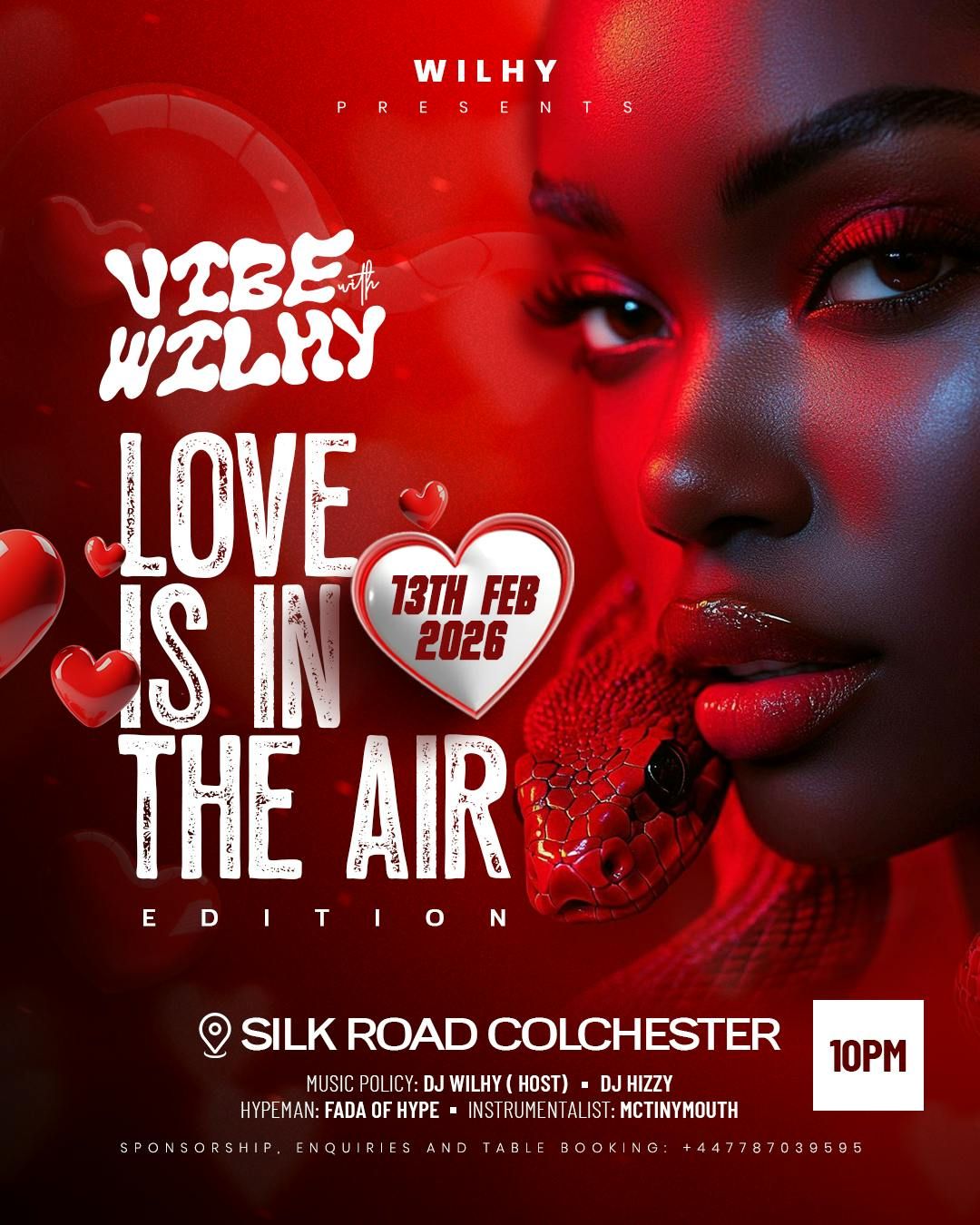 Join us for a magical evening at the "Love in the Air Edition" of VibeWithWilhy on February 13th at Silk Road, Colchester! Experience an unforgettable night filled with love, music, and vibrant energy. Celebrate love in all its forms as you enjoy live performances by talented artists, setting the perfect romantic atmosphere. Let loose on the dance floor and meet new friends who share your vibe.Whether you're single, coupled up, or just looking to have fun, this event promises an enchanting night that brings people together. Don’t miss out on the chance to create beautiful memories! Get your tickets now and let love fill the air!