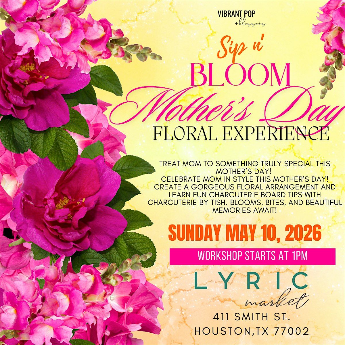 Let's make Mom's heart bloom! Create you own Vibrant Floral Arrangement while sipping bubbly cocktails and listening to some great music. You and your friends will have a afternoon full of fun! These flower arrangements makes a great gift or a beautiful centerpiece for your home.