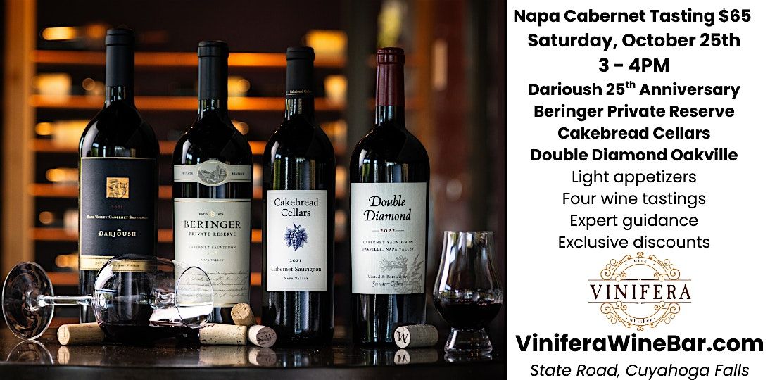 Welcome wine lovers! 🍷 Join us for Vinifera's Napa Valley Cabernet Sauvignon Tasting at Vinifera Wine Bar on October 25, 2025 at 3:00 PM. Savor the rich flavors of Napa Valley's finest Cabernet Sauvignon while mingling with fellow enthusiasts. Don't miss this opportunity to indulge in a delightful evening of wine tasting and discovery. See you there!
