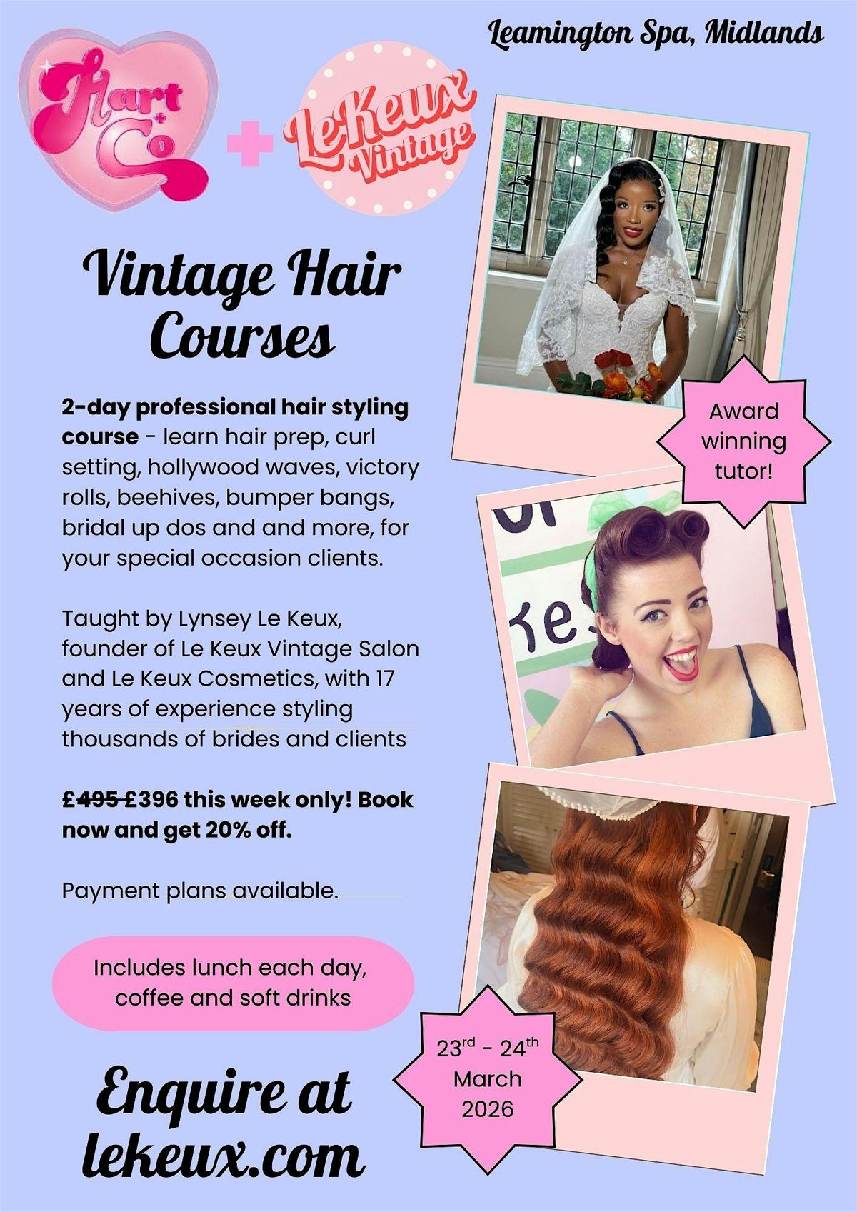 Join us for a fun and hands-on 2-day professional hair styling course where vintage vibes meet modern skills. This in-person event is perfect if you want to master classic looks that never go out of style. Learn hair prep, curl setting, hollywood waves, victory rolls, beehives, bumper bangs, bridal up dos and more for your special occasion clients. Don’t miss out on this opportunity to dive into the world of vintage hair styling!