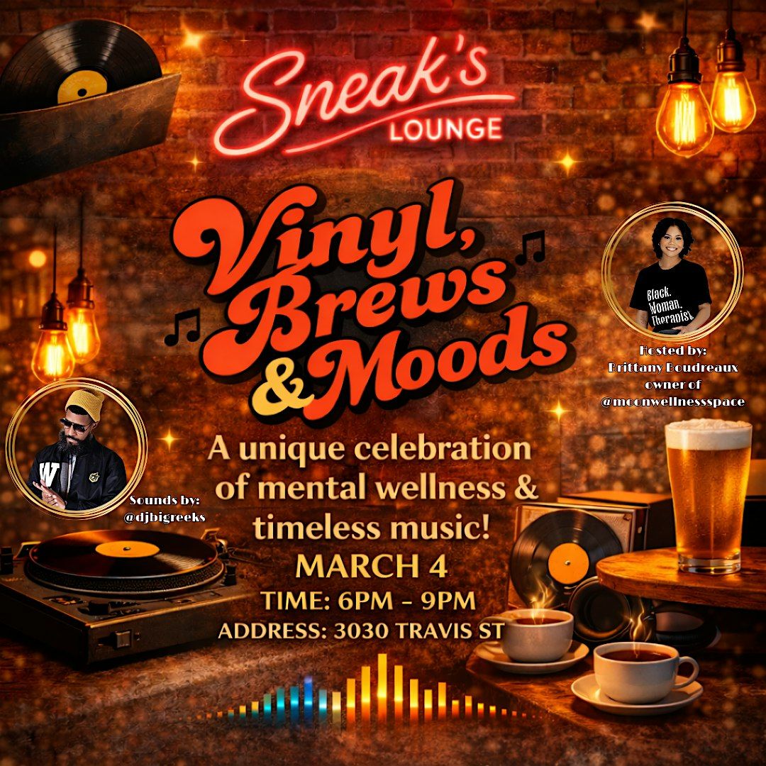 Join us for Vinyl, Brews & Moods, a unique celebration of mental wellness, timeless music, and creative expression. Hosted by Moon Wellness Space and set in the vibrant ambiance of Sneaks Coffee Lounge, this event is designed to uplift your spirit and connect you with your community.