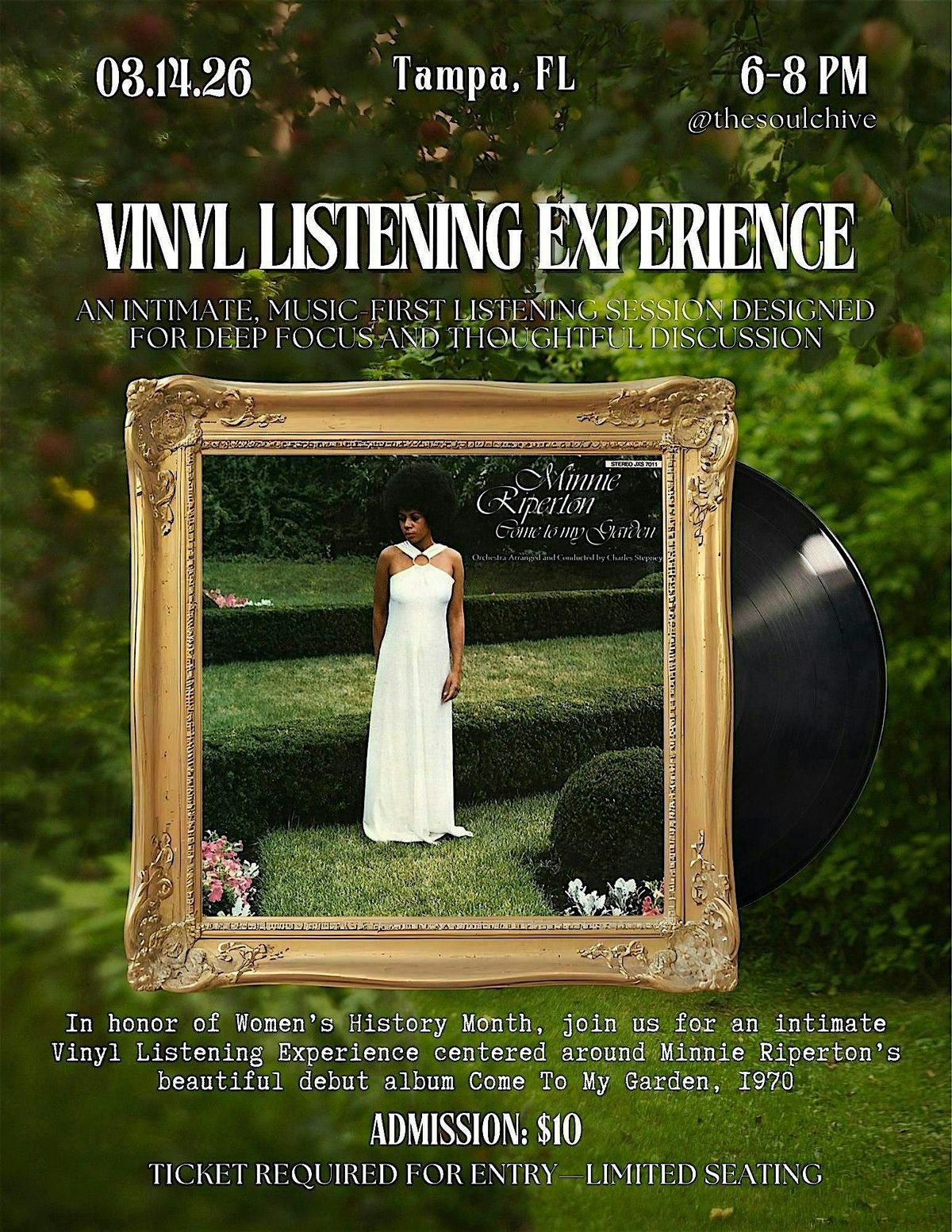 Join us for an intimate vinyl listening experience centered around Minnie Riperton’s luminous debut album, Come to My Garden.