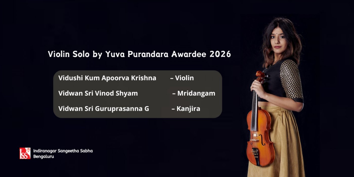 Immerse yourself in an evening of lyrical beauty and youthful mastery as Vidushi Kum Apoorva Krishna, the Yuva Purandara Awardee 2026, takes center stage with a spellbinding Carnatic violin solo. Known for her expressive bowing, technical finesse, and emotive depth, Apoorva represents the vibrant new wave of Carnatic instrumentalists.