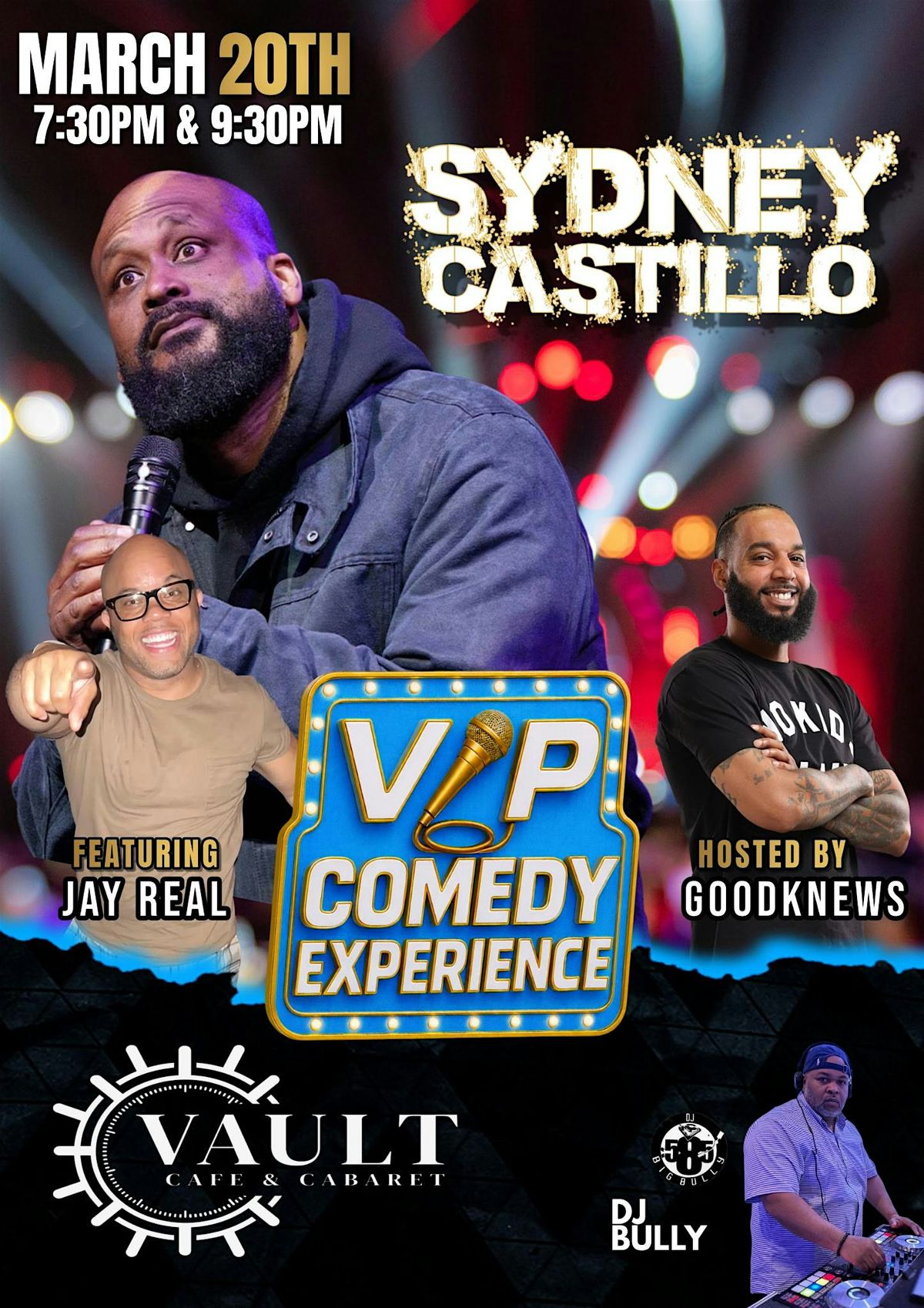 GET THE VIP EXPERIENCE WITH SYDNEY CASTILLO AND JAY REAL We Also have CHRIS "GOODKNEWS" CARDWELL as our host WITH DJ BULLY ON THE BEATS! THE VAULT CAFE & CABARET. 1322 Culver Rd Rochester, NY 14609. FRIDAY MARCH 20TH 2026. Show Doors Open At 7PM for 730PM Start Time and 9pm For 930pm Start