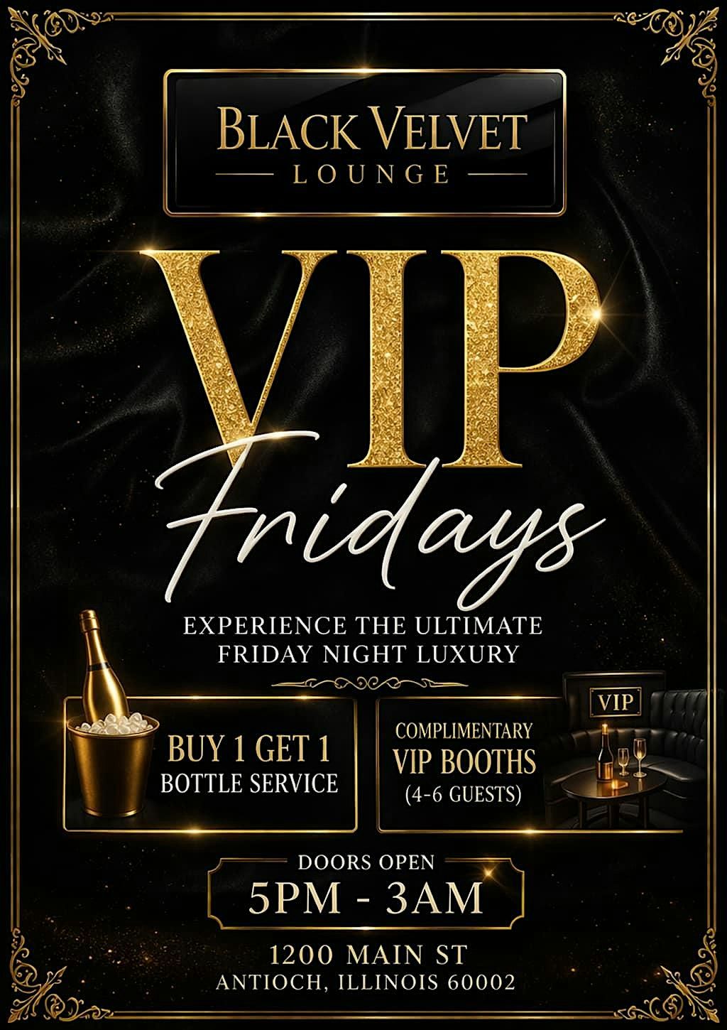 Experience the Ultimate in Friday Night Luxury at the Black Velvet Lounge in Antioch, Illinois featuring a Bottle Service at Buy 1, Get 1 and Complimentary VIP Booths (4-6 Guests. First Come, First Serve). Doors Open 5pm to 3am.