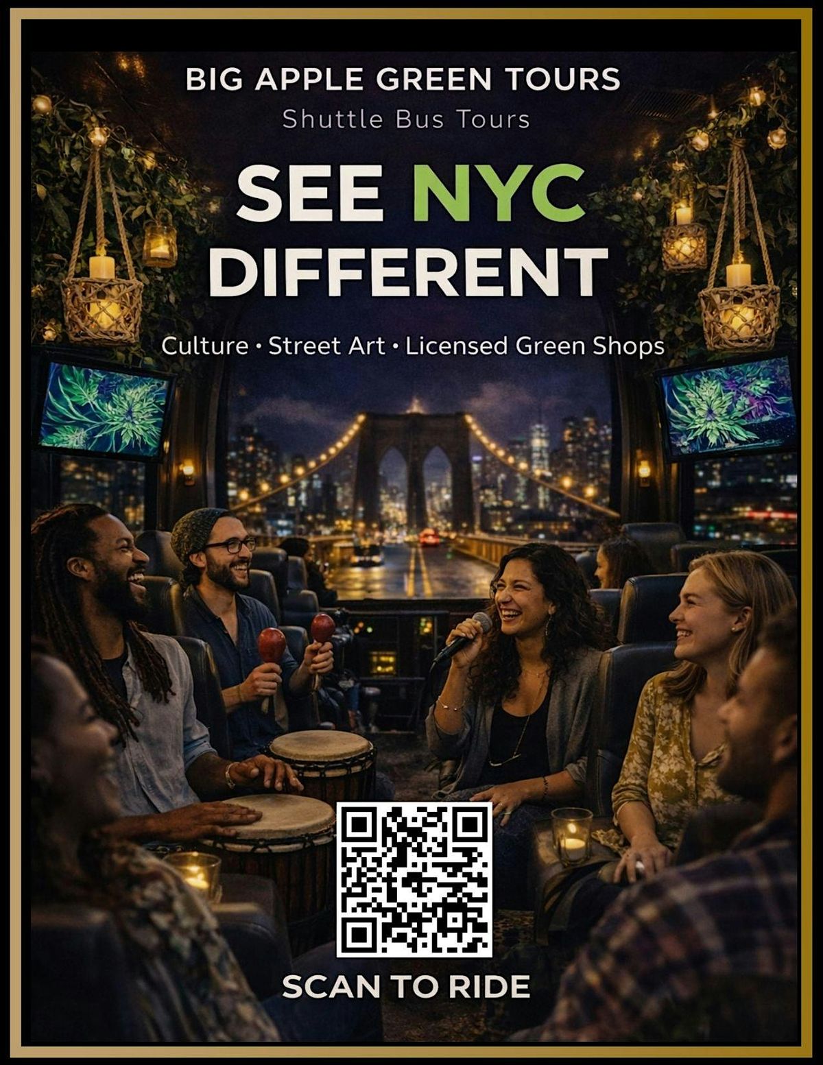 This is not a smoke bus. The experience is centered around NYC culture — including urban art scenes, city landmarks, and visits to licensed dispensaries — all within a curated, laid-back, good energy environment.
