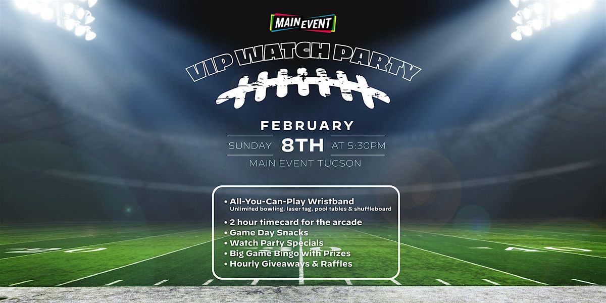 Join us Sunday, February 8th at 5:30 PM for the ultimate VIP Watch Party! Get ready for a night packed with nonstop games, prizes, and all the action you can handle.