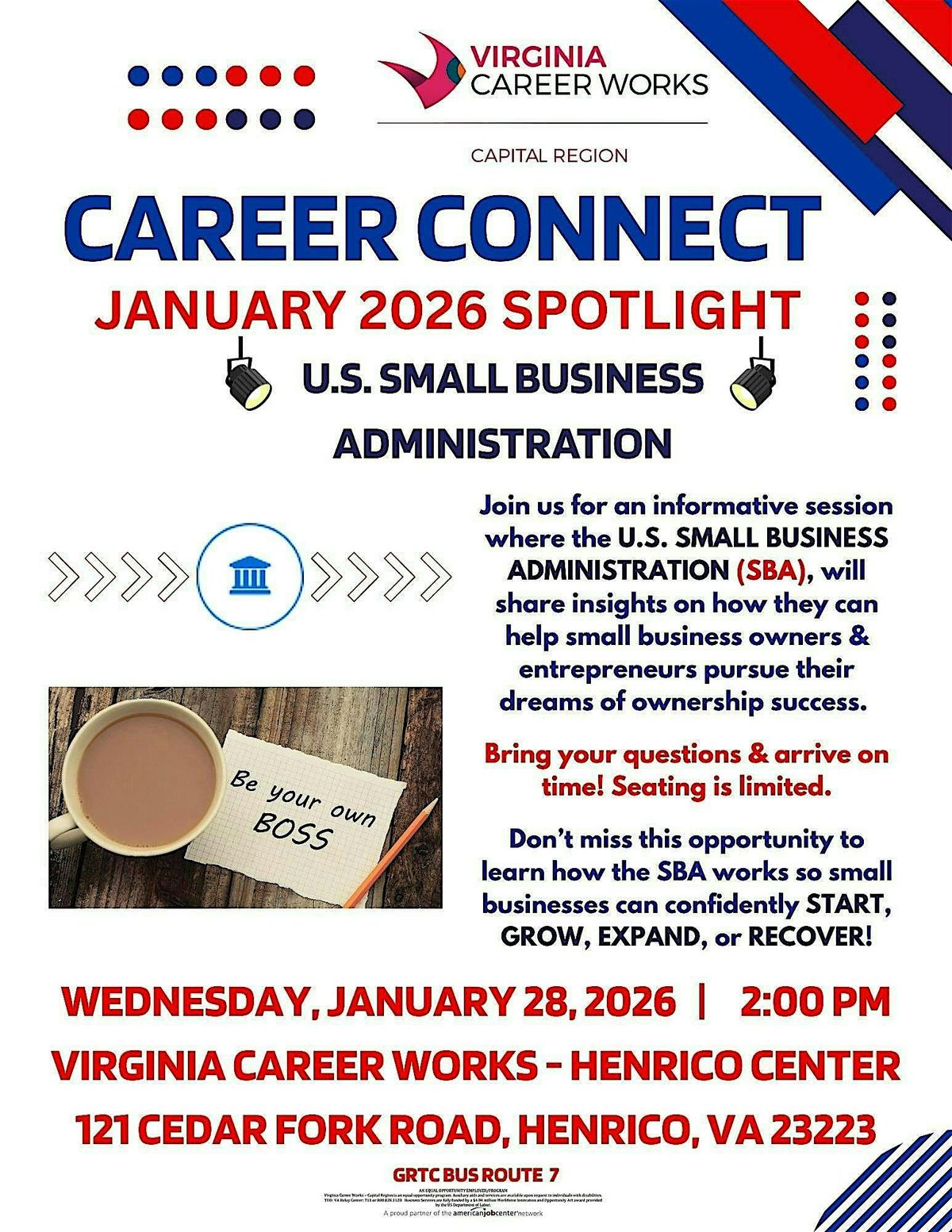 Looking to grow or start your own business? Join us for our January 2026 Virginia Career Works – Capital Region’s Career Connect session!