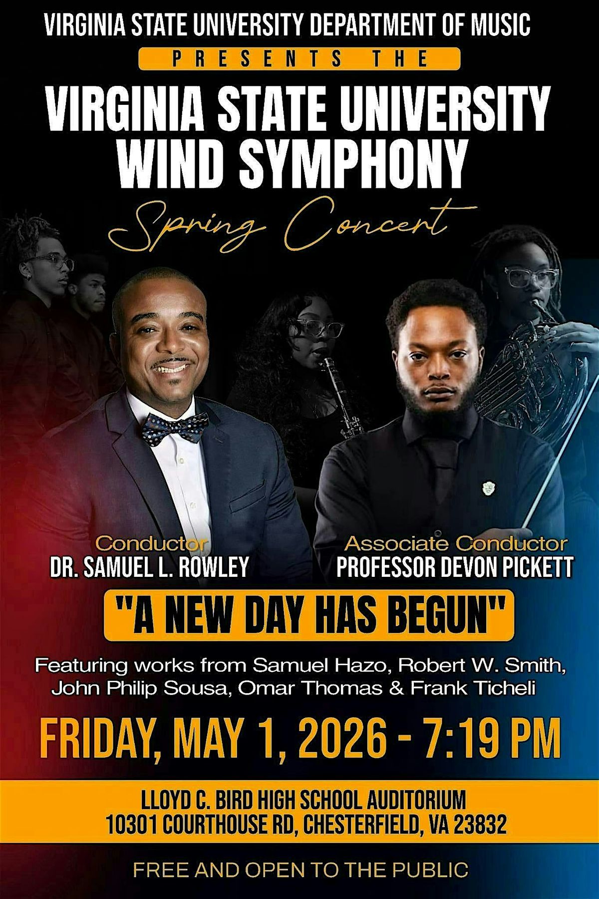 The Virginia State University Wind Symphony presents A New Day Has Begun a performance that will capture the spirit of renewal and resilience through powerful and expressive wind band repertoire. The program will feature Omar Thomas’ landmark work Come Sunday a deeply moving and soulful composition that highlights the richness and traditions of the Black Church. The ensemble will be lead by Dr. Samuel Rowley and Professor Devon Pickett.This engaging musical program offers a compelling experience you won’t want to miss!