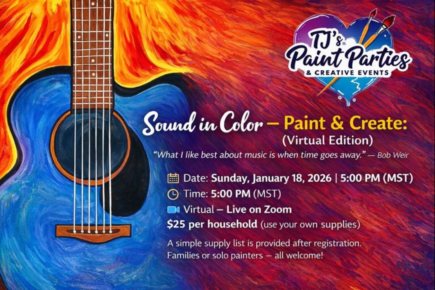 Join us from the comfort of your own home to paint this vibrant, expressive guitar surrounded by warm, flowing color. Listen to your favorite tunes and share your favorite music memories.