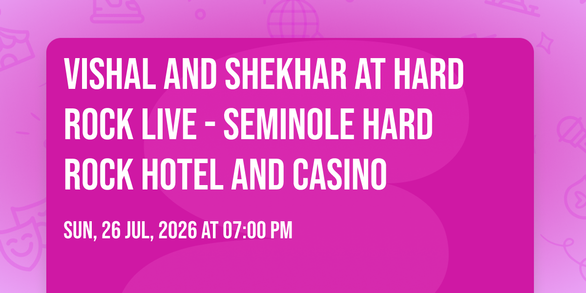 🌟 Step into a world of wonder at Vishal and Shekhar at Hard Rock Live - Seminole Hard Rock Hotel and Casino, where extraordinary moments await! 🏛️ Located at Hard Rock Live - Seminole Hard Rock Hotel and Casino in dynamic Hollywood, FL, this event will become the talk of the town. 📅 Join us on July 26th, 2026 at 07:00 PM for a celebration that defies the ordinary. ✨ This curated experience brings together the best of entertainment, culture, and community spirit. Every detail has been thoughtfully planned to ensure an unforgettable experience for all our guests. 🎯 Take advantage of this opportunity to be part of something special. 🎊 Early registration is recommended as space is limited!