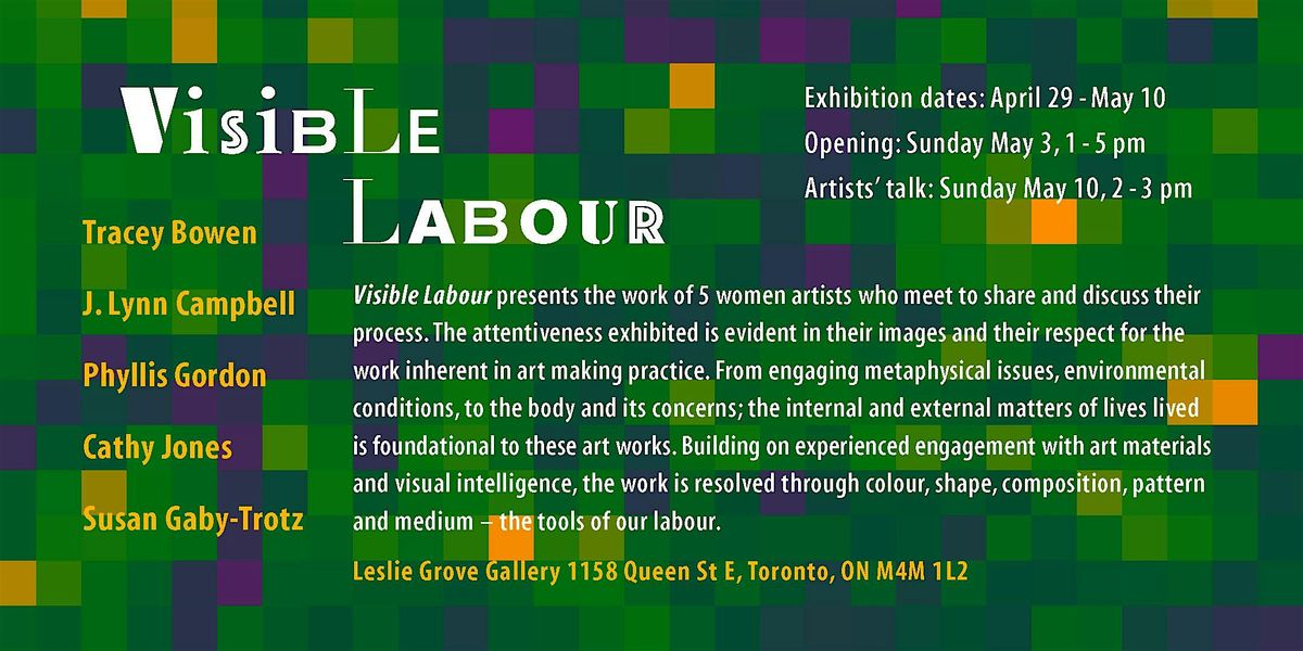 “Visible Labour” presents the work of 5 women artists who meet to discuss their work, exposing it to each other’s sensibilities as a counterweight to artistic isolation. The work in the exhibition has emerged from their individual practices, using a breadth of techniques; however, the sharing is collective, visually intelligent and sustained. The Leslie Grove Gallery from April 29-May 10. Gallery hours: Wednesday to Sunday 12-5 PM. Opening reception will take place on Sunday, May 3, 1-5 pm.