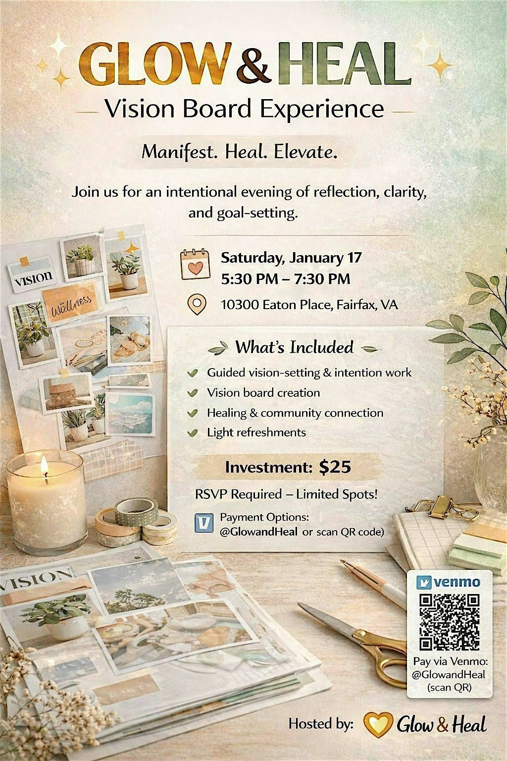The Vision Board Experience is an interactive, intentional wellness event designed to help participants reflect, reset, and realign their goals for the upcoming season. Through guided reflection, creative expression, and community connection, attendees will create a personalized vision board that represents their aspirations for mind, body, career, relationships, and overall well-being.