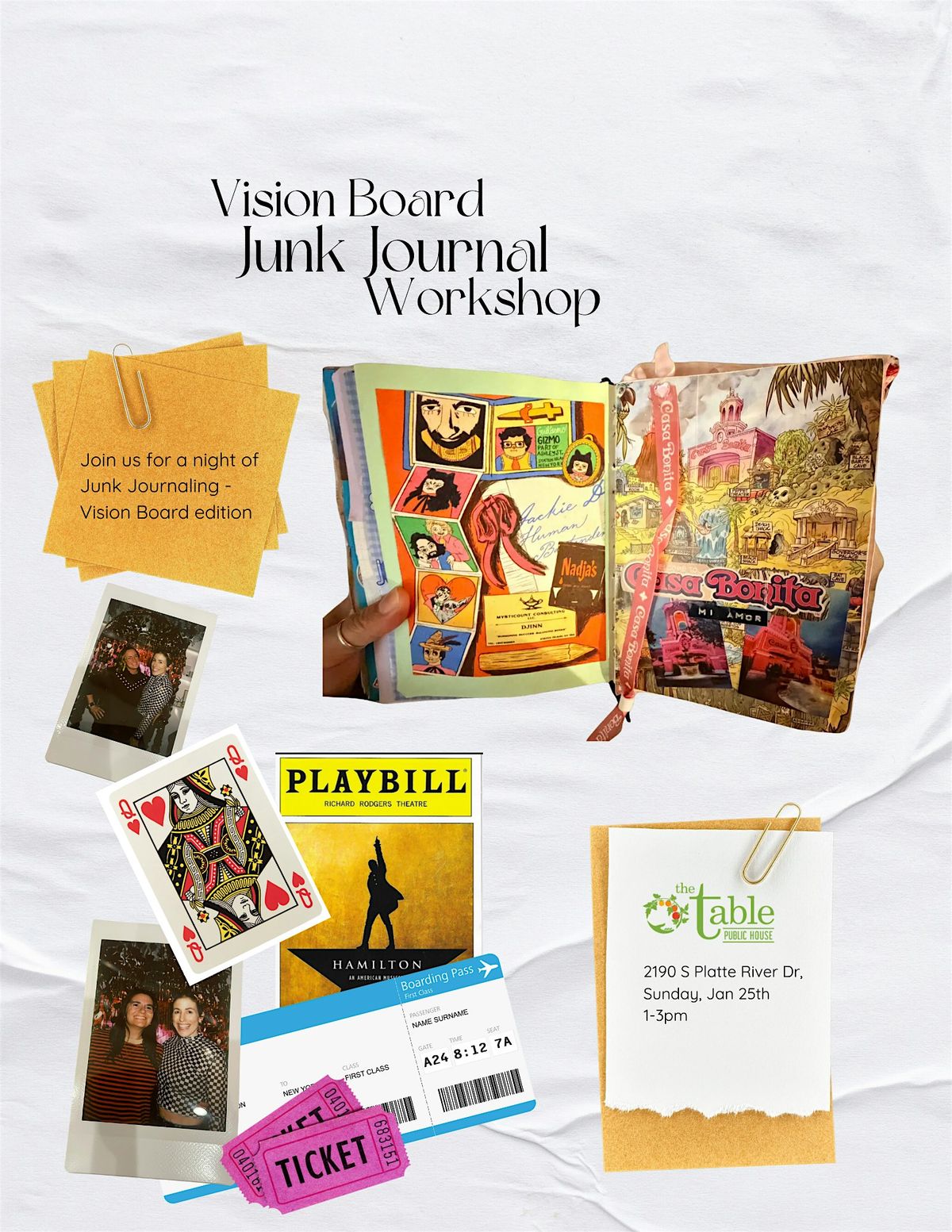 Each participant will receive a vision board kit filled with patterned papers, stickers, ribbons, and cutouts. We’ll also have communal bins of magazines and scrap paper available for everyone to use. Guests are encouraged to bring cards, mementos, photos, or other meaningful pieces to personalize their journals and set intentions for a fabulous year ahead. You’ll also have the option to snap a photo on-site to include in your layout.
