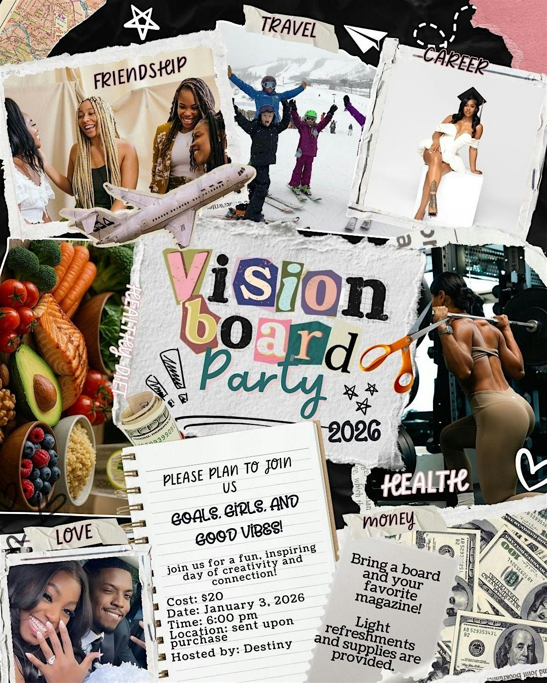 Join us for an inspiring and intentional Vision Board Party, where creativity meets clarity and purpose. This experience is designed to help you reflect, reset, and boldly visualize the life you desire in the upcoming season.