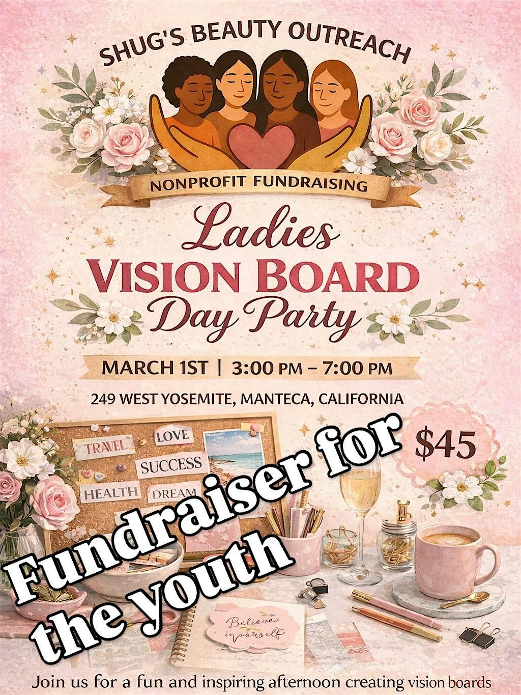 Join us in person for a fun and creative session where we'll bring our dreams to life on vision boards. It’s all about setting goals, getting inspired, and sharing good vibes. Having fun while helping our youth.All supplies, snacks and drinks are included. This is a nonprofit organization looking to help teens with trauma. 100% of proceeds goes to helping fund supplies for workshops , activities and support groups at Shugs Beauty Outreach for the youth.