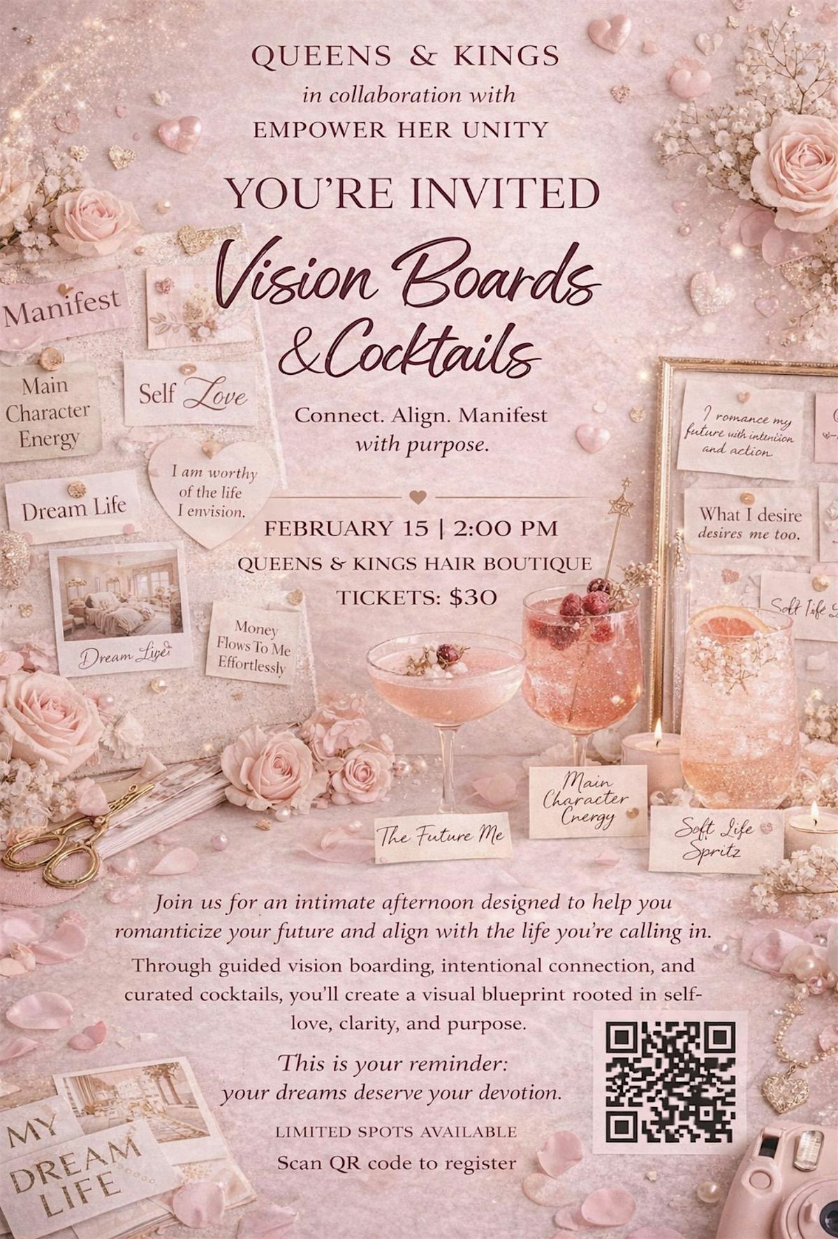 Come join us for a fun afternoon of creativity and cocktails at Edmontons Queens & Kings Hair Boutique! Let's celebrate friendship and self-discovery as we sip on delicious drinks and create vision boards for the year ahead. No artistic skills required, just bring your positive vibes and get ready to manifest your dreams!