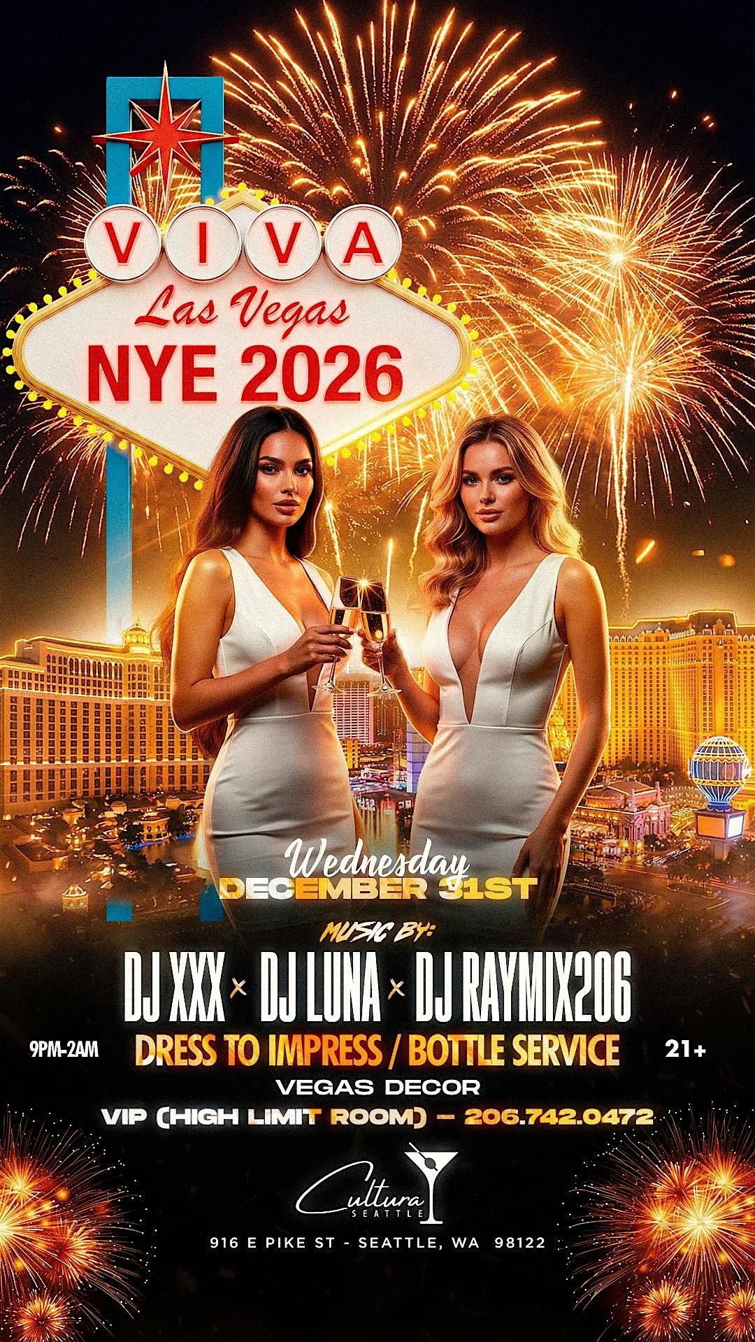 Ring in the new year in style at Cultura Seattle! Join us for an unforgettable night filled with fun vibes, great company, and a splash of that iconic Las Vegas flair. This is the perfect way to celebrate NYE 2026 up close and personal. Don’t miss out on the party of the year—get ready to dance, laugh, and welcome 2026 like never before!