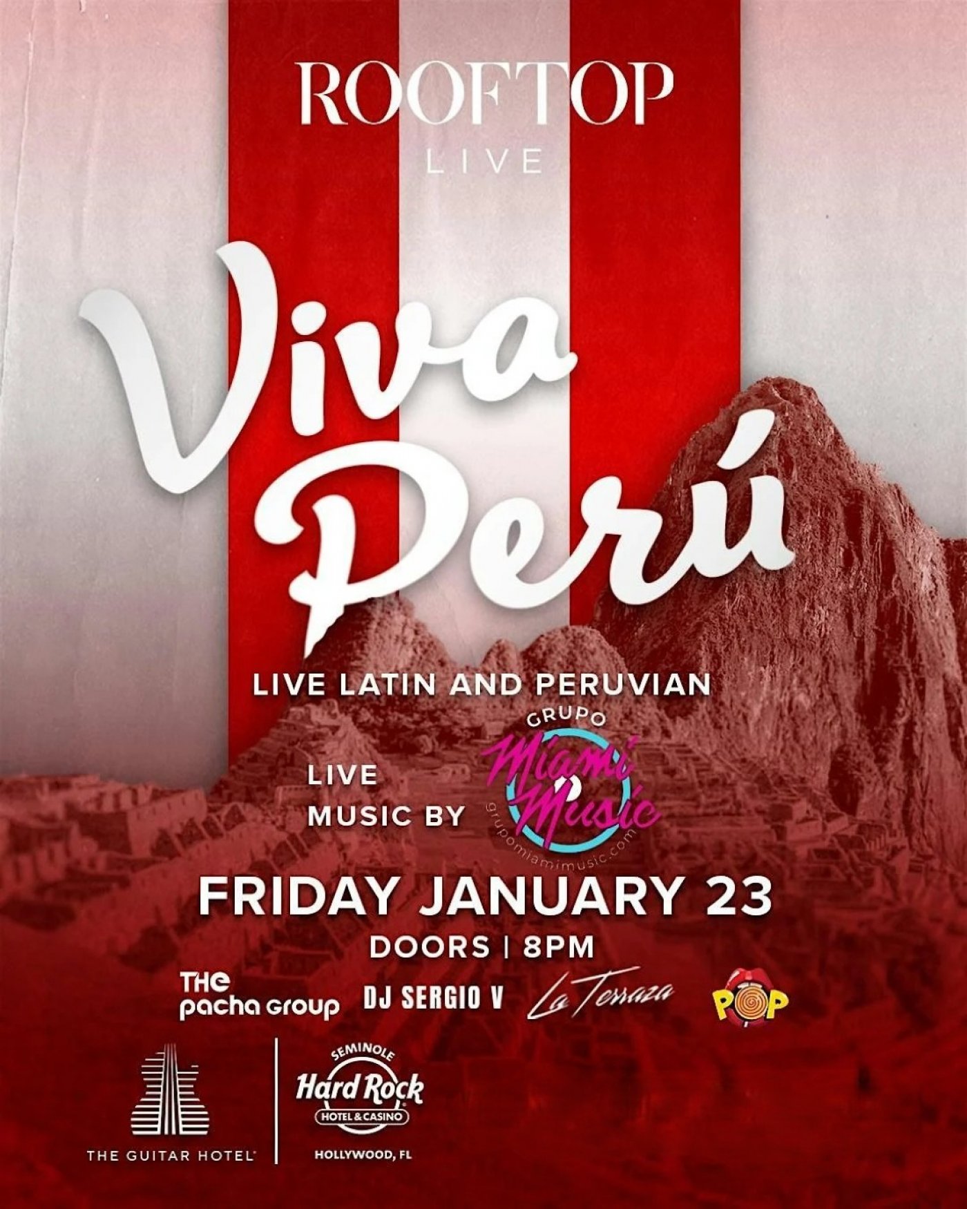 LA TERRAZA Viva Peru with Miami Music Group Friday JANUARY 23rd @ THE ROOFTOP. LIVE Salsa, Merengue, Bachata