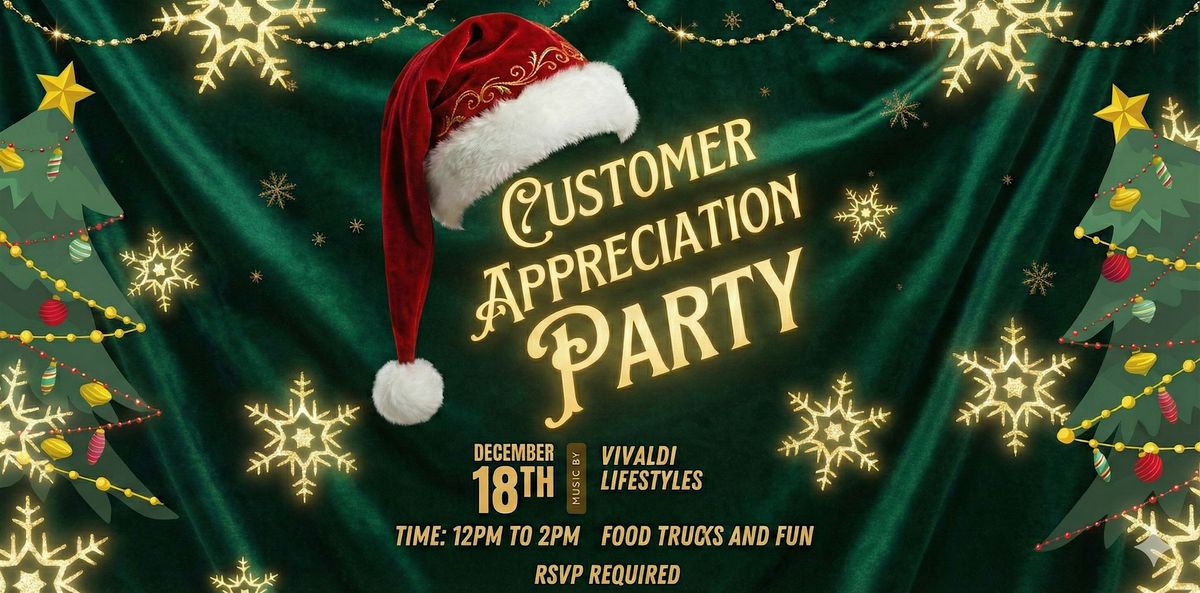 Welcome to our Vivaldi Lifestyles Customer Appreciation Party! Join us at 12614 Hempstead Rd on December 18, 2025 at 12:00 PM (Central Time) for a lunch filled with fun, music, and gratitude for our amazing customers. Let's celebrate together!