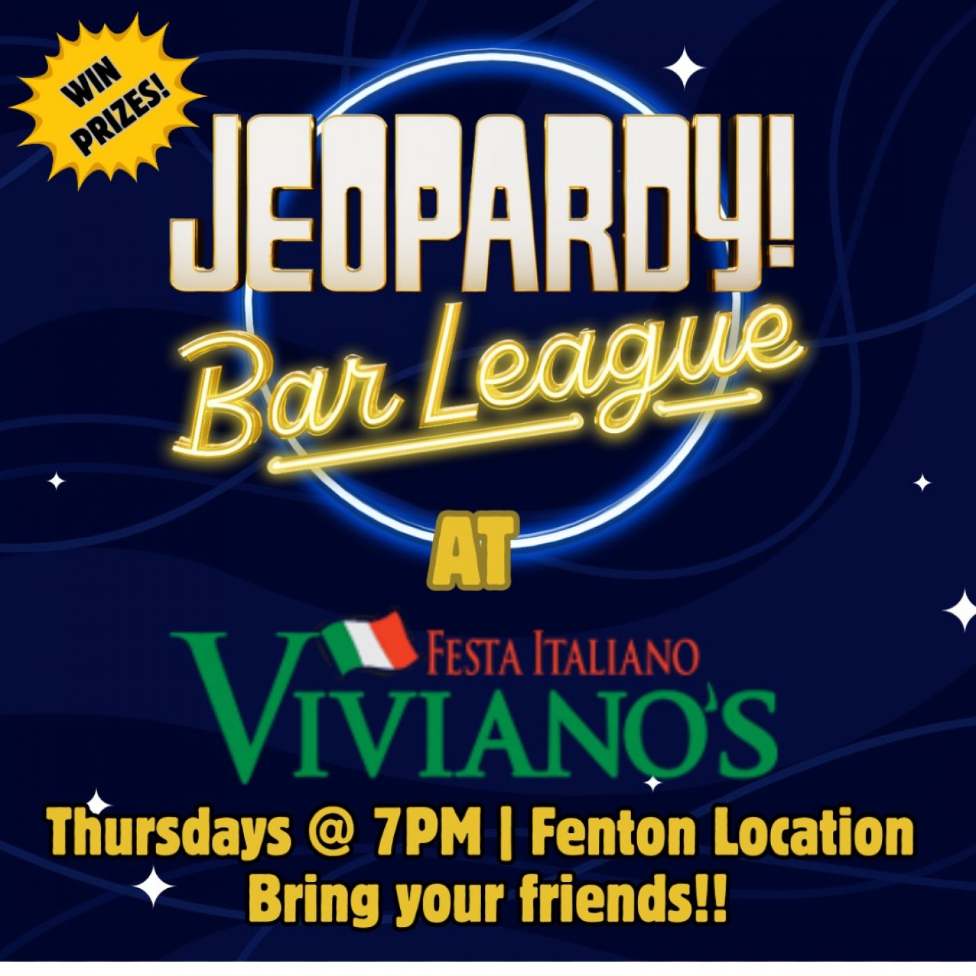 Jeopardy bar league on Thursday nights 7 pm Fenton Viviano's location! Win prizes, eat great food, have some fun!