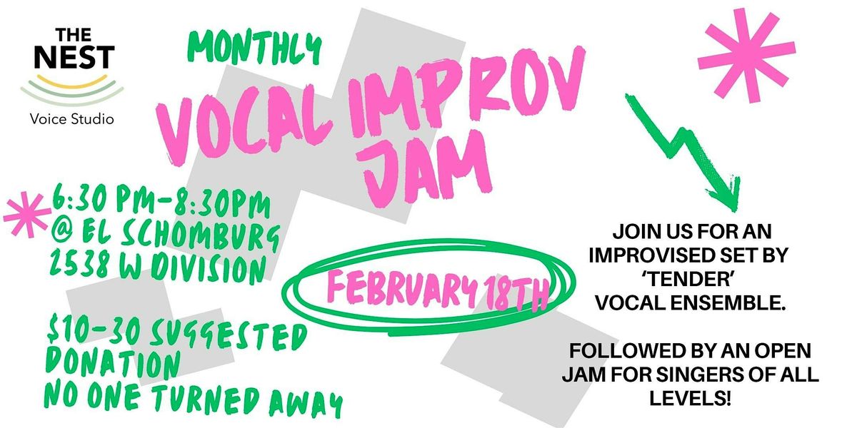 Come experience vocal music that invites you to rest, reflect, and feel the resonance of collaborative creation. The Nest presents an evening of warm and intimate musical nourishment - the Vocal Improv Jam. This event is for singers across genres and styles who are looking to deepen their practice, develop a more intimate relationship with their voices, and feel the support of others in hearing and making new sounds. The evening opens with a short set from Tender, a vocal ensemble (including but not limited to Stacy Erenberg, Emmy Bean, Jacob Rosner, Yvette Mushimiyama, Michele Thomas and friends) and continues with an open jam for all to join or listen to at your own pace. Singers at any level of experience or training are welcome, and we are eager to share this space with you for musical practice, rejuvenation, and real human connection.