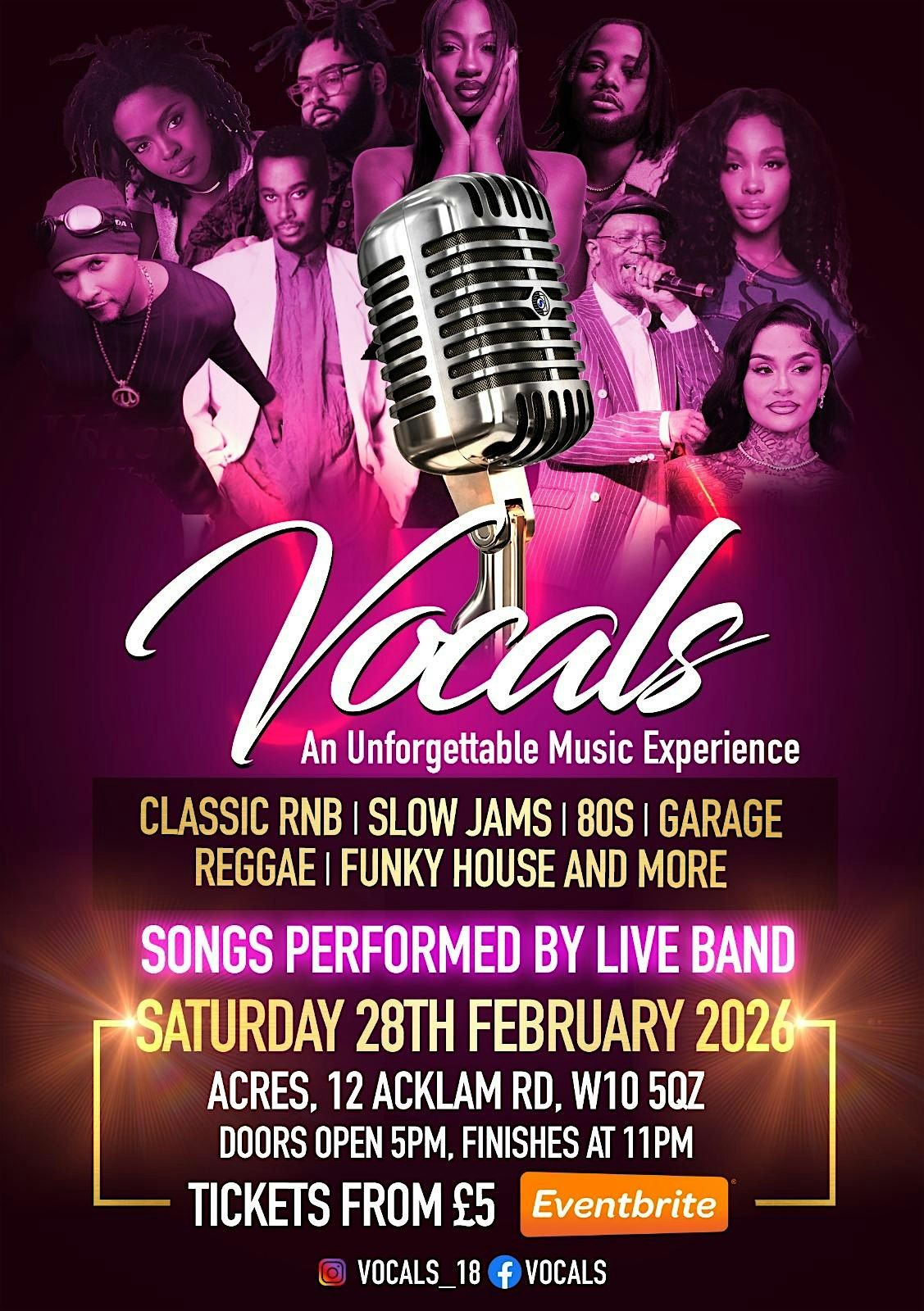 Vocals is a one-of-a-kind music event that leaves an unforgettable mark on everyone who attends. With a captivating lineup of talented vocalists and musicians, the atmosphere is charged with energy and emotion, creating a magical experience from start to finish. Our performance is filled with raw passion and powerful harmonies, drawing the audience into an immersive journey through music. The carefully curated sound, the vibrant crowd, and the shared love for music make Vocals an event like no other.