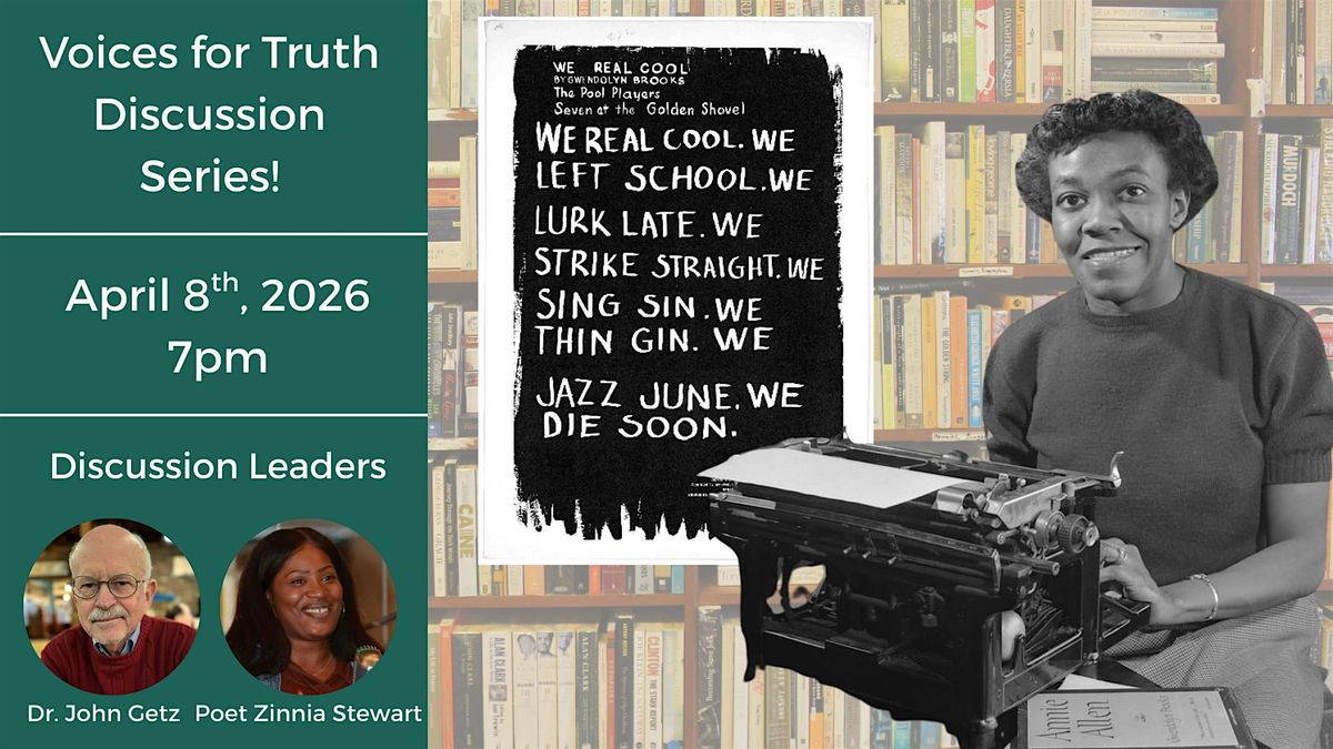 Join us for our Voices for Truth series where we will be discussing the work of Gwendolyn Brooks, the first African American poet to win the Pulitzer Prize and the first African American woman to be Consultant in Poetry to the Library of Congress, a position now called Poet Laureate. She is credited with bridging “the gap between the academic poets of her generation in the 1940s and the young Black militant writers of the 1960s.”