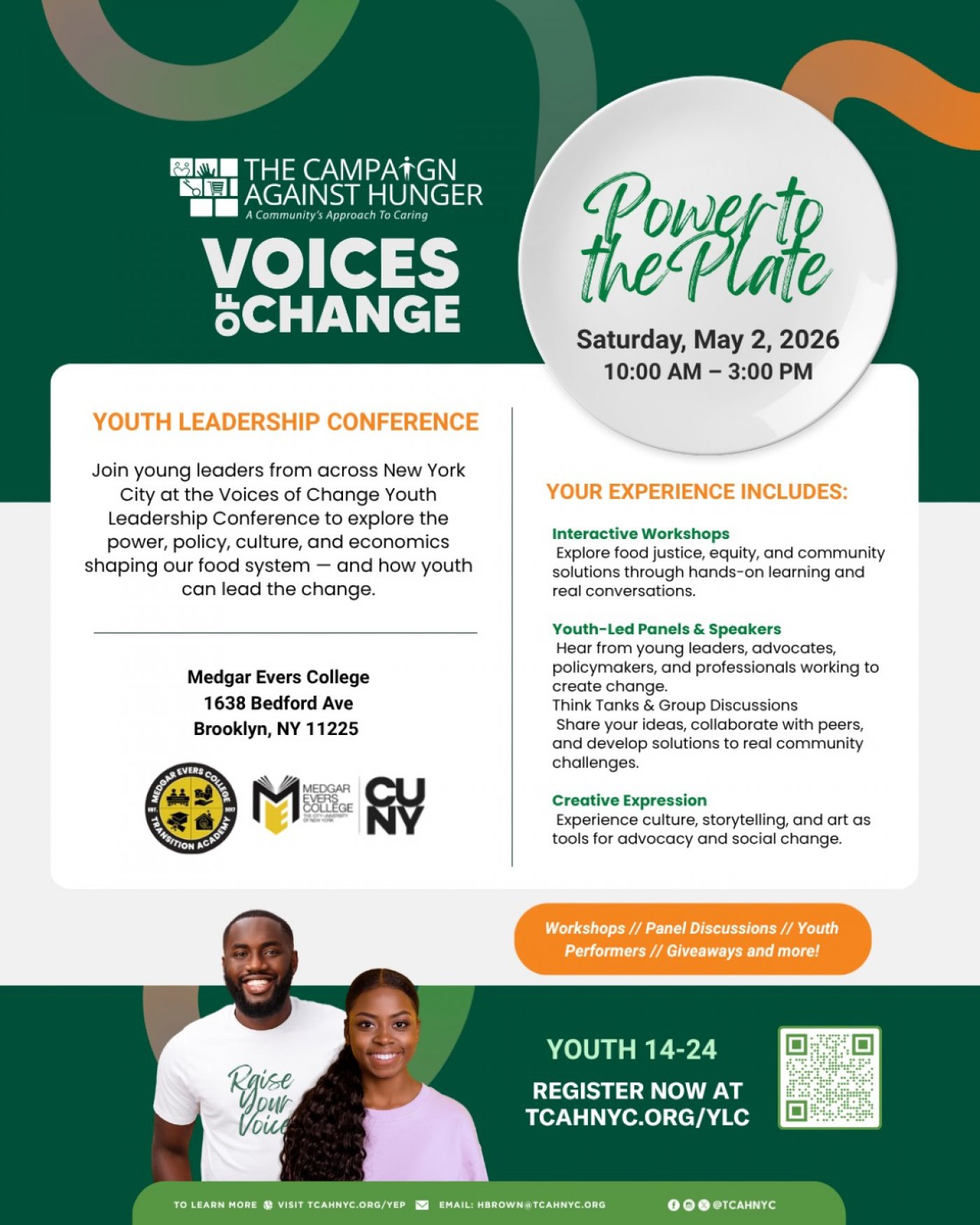We are excited to invite you to our Voices of Change Youth Leadership Conference, taking place on May 2, 2026, at 10:00 AM at Medgar Evers College, 1650 Bedford Avenue, Brooklyn, NY 11225.