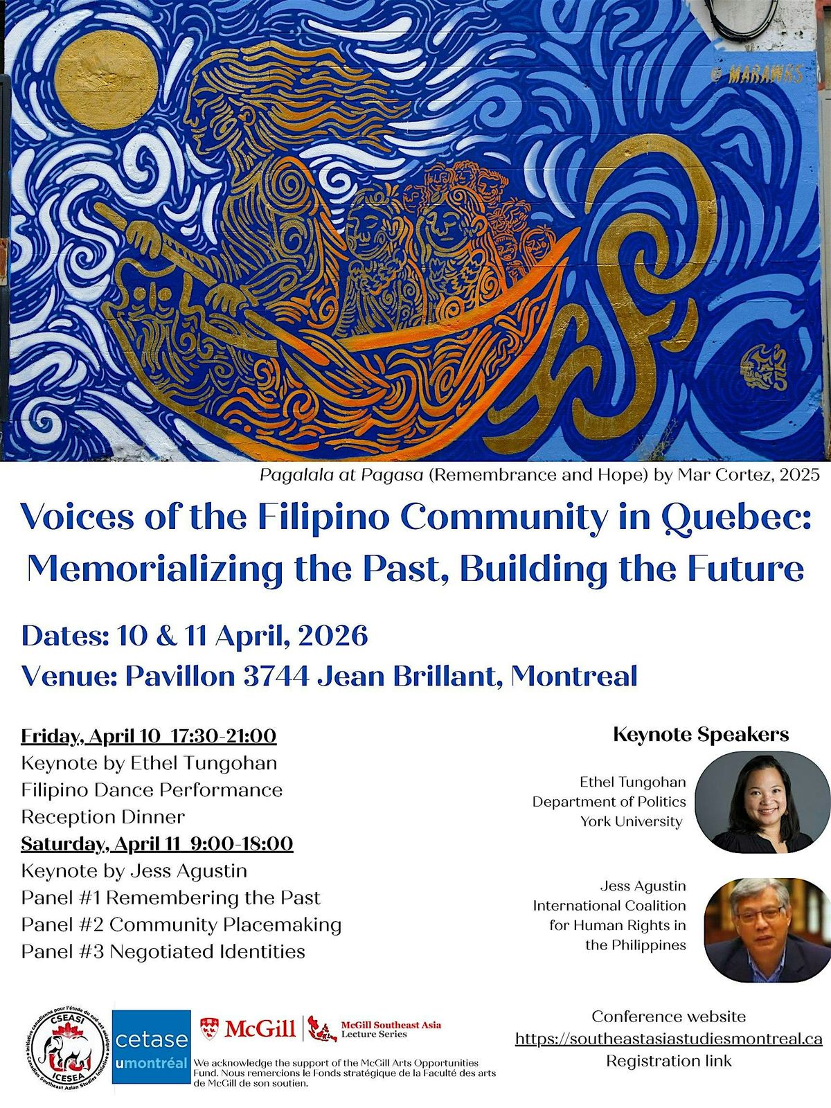 As part of the Canadian Southeast Asian Studies Initiative, McGill University and Université de Montréal will host "Voices of the Filipino Community in Quebec: Memorializing the Past, Building the Future" on April 10-11, 2026.