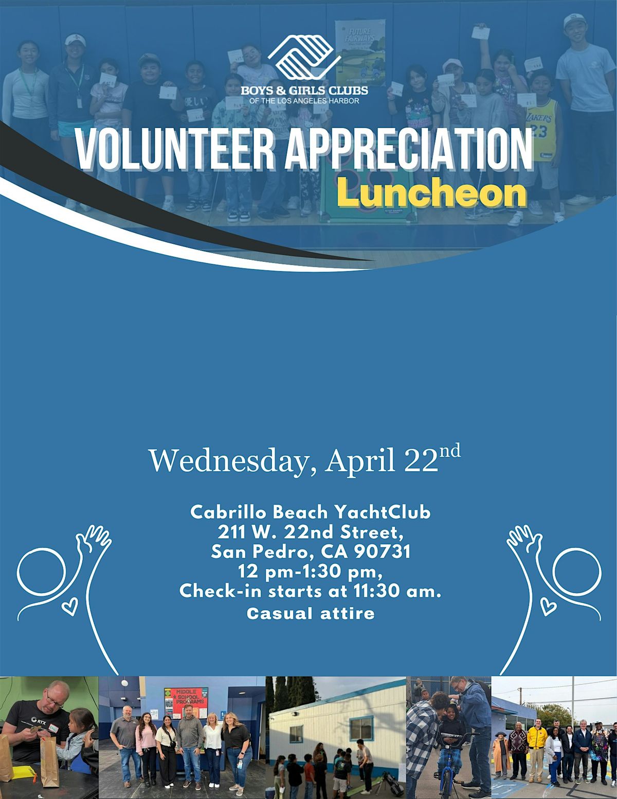 Join us at the Cabrillo Beach Yacht Club for a fun and relaxed Volunteer Appreciation Luncheon! Itβs our way of saying thanks to all the amazing volunteers who make a difference. Come enjoy good food, great company, and some well-deserved recognition on April 22, 2026 at 11:30 AM (Pacific Time). We can't wait to celebrate with you in person!