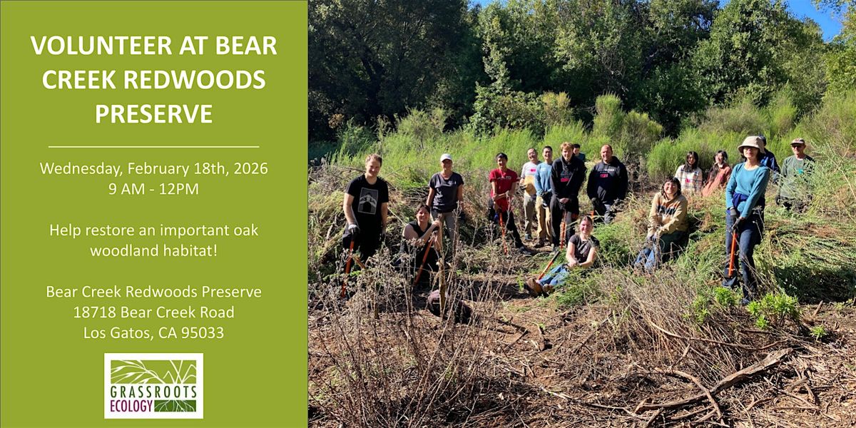 Join us at Bear Creek Redwoods Preserve, a Midpeninsula Regional Open Space Preserve, to help eradicate invasive plants and to restore habitat! Participants can expect to walk with 10 to 12 lb. tools through an exposed and hilly terrain for up to 1 mile (round trip) to remove a weedy shrub called French broom. Volunteers can also expect a guided walk on the natural history of the preserve.