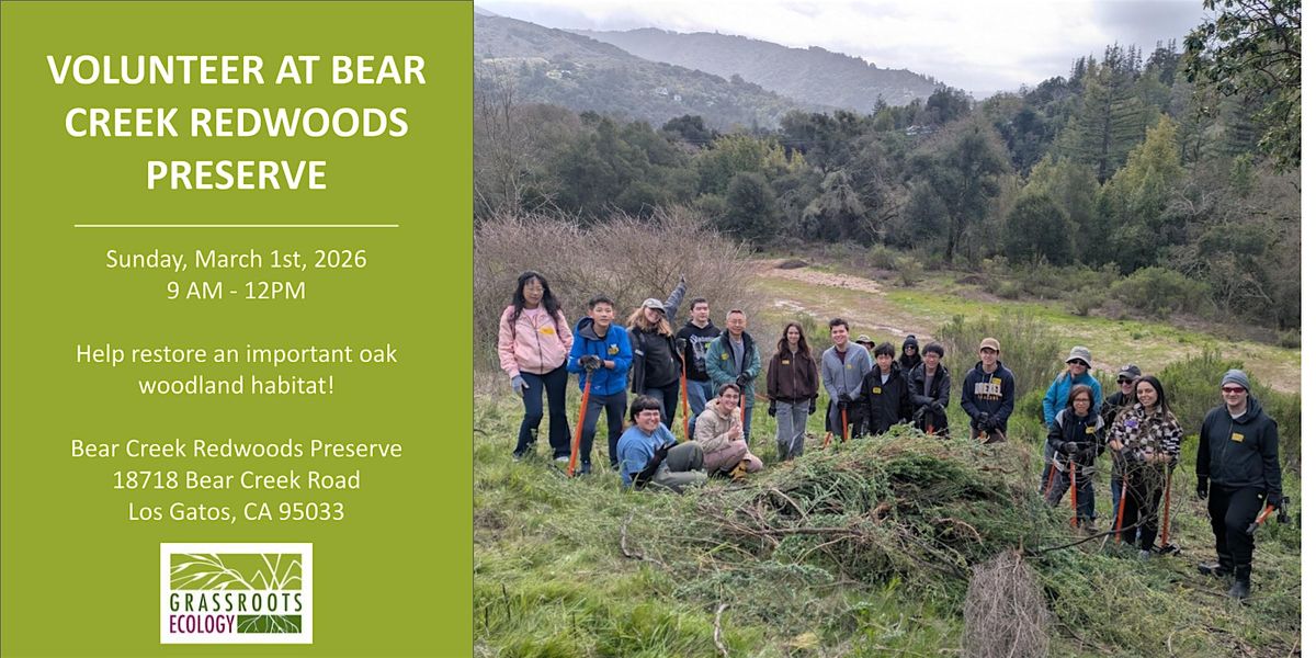 Join us at Bear Creek Redwoods Preserve, a Midpeninsula Regional Open Space Preserve, to help eradicate invasive plants and to restore habitat! Participants can expect to walk with 10 to 12 lb. tools through an exposed and hilly terrain for up to 1 mile (round trip) to remove a weedy shrub called French broom. Volunteers can also expect a guided walk on the natural history of the preserve.