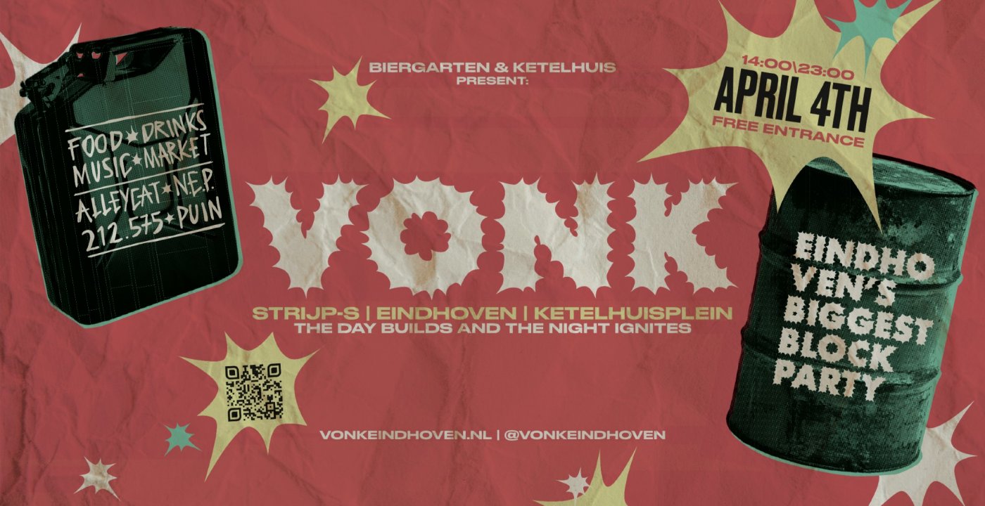 Presenting VONK, Eindhoven's biggest blockparty by Biergarten and Ketelhuis - where music, art, food and community come together in the heart of Strijp-S in collaboration with Alleycat, 212.575, Puin Collective, Threshold Enterprises, N.E.P. and many more.