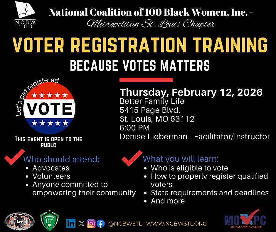 This event is presented in partnership with Better Family Life, the Missouri Voter Protection Coalition, and Iota Phi Lambda Sorority, Eta Gamma Chapter.