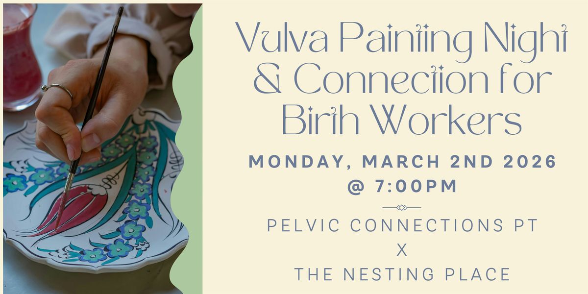 Join us for a relaxed in-person evening of creativity and connection! This night is all about celebrating the beauty of vulvas through painting, while building community with fellow birth workers. Whether you're here to unwind, express yourself, or simply connect, this event offers a warm, supportive space. Bring your open heart and get ready for some inspiring art and meaningful conversations! Tickets are $25 each, please book through: https://www-154g.bookeo.com/bookeo/b_thenestingplace_start.html?ctlsrc2=VJO6dl1wDycZZ96OflWET44nmvIevEXVmsgMkl48z6w%3D&src=02j&devent=3154T7M9UU19BBE6A811B_2026-03-02_nXxJNMmxw8z