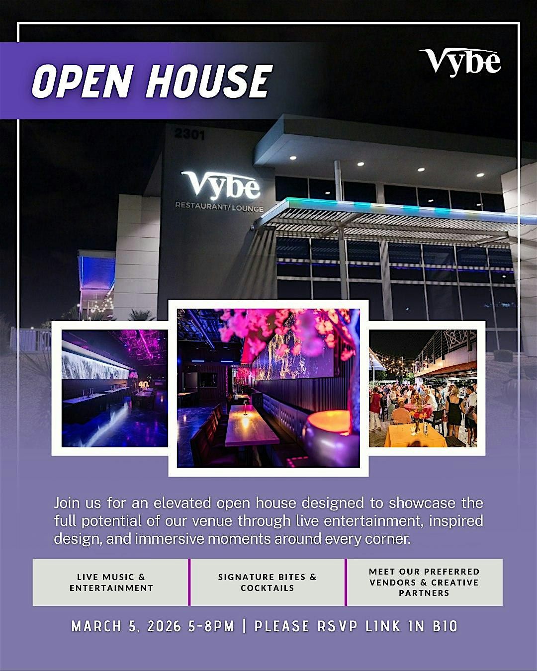 Join us and "Experience Your Vybe" at the Vybe Open House, designed to showcase the full potential of our event venue through live entertainment, inspired design, and immersive moments around every corner!