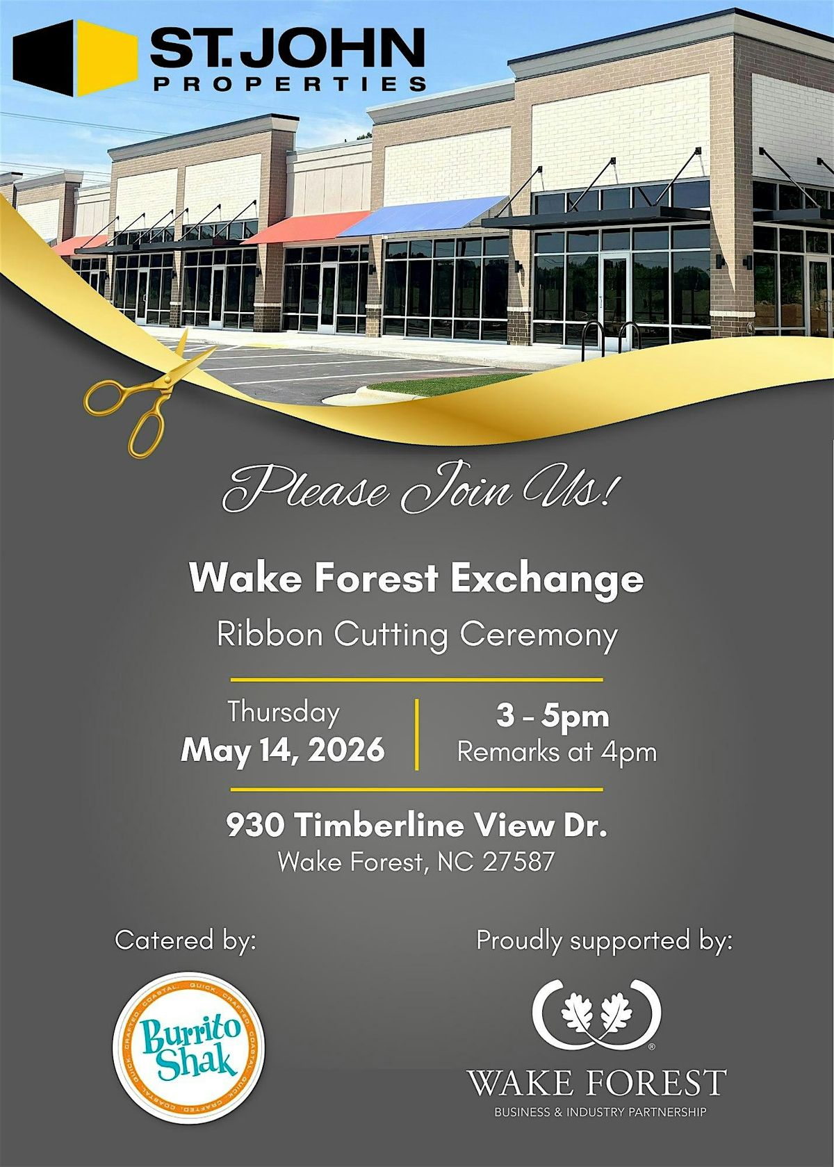 On Thursday, May 14, 2026, please join us at 3pm as we celebrate the ribbon cutting of Wake Forest Exchange, an exciting new flex, R&D, medical, and retail development bringing significant new jobs, investment, and opportunity to Wake Forest right along US1/Capital Boulevard. Come and mark this milestone with us! Celebrate with food and drink, and connect with community leaders, project partners, colleagues, and friends!