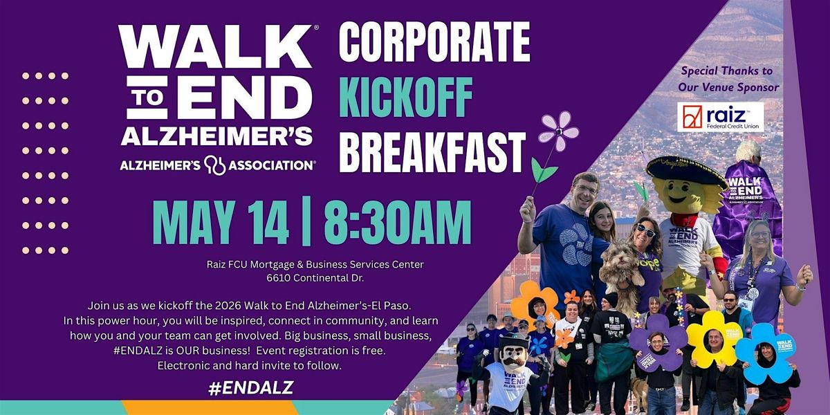 Join us for this free event hosted by the Alzheimer’s Association- West Texas Chapter. This breakfast brings together influential leaders to learn more about the Association’s mission, the impact the disease has on our community and how your company can play a vital role in driving change through Walk to End Alzheimer’s®. In this power hour, you will learn, get inspired and energized to make a difference. #ENDALZ
