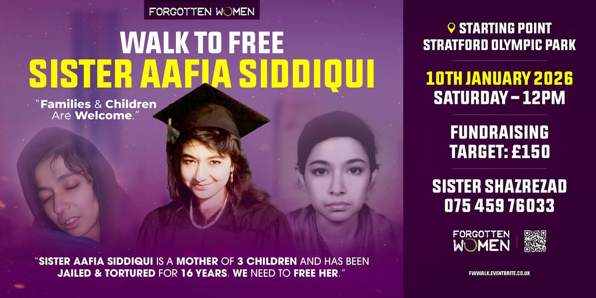Join us on Saturday, 10th January 2026 for a powerful community walk in support of Sister Aafia Siddiqui, a mother of three who has been imprisoned and tortured for 16 years. Together, we will raise our voices and take meaningful steps towards justice.
