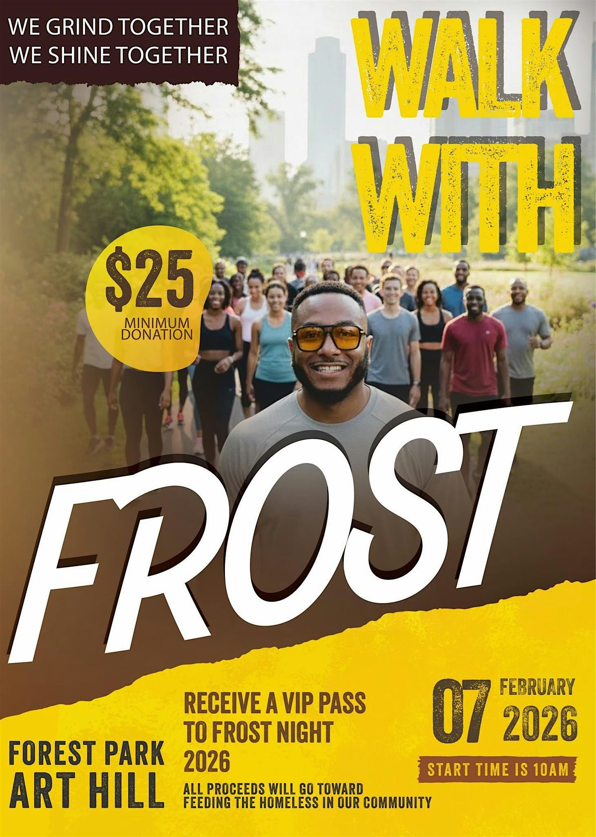 WalkWithFrost Feb 7 at 10 AM, Art Hill. Donate $25, get VIP Frost Night 2026 pass. Proceeds support meal outreach.