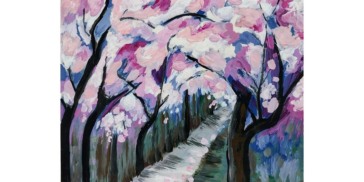Step into spring and learn how to paint a magical walkway surrounded by blooming cherry blossom trees. In this acrylic painting class, students will explore techniques for creating soft petals, textured tree branches, and a glowing pathway filled with light and color.