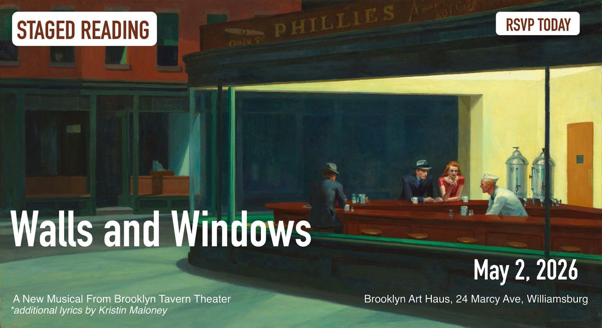 Join Brooklyn Tavern Theater and friends for Walls and Windows Saturday, May 2 at Brooklyn Art Haus--we will showcase a revised script and new music as we prepare for a future production. Come hear the new script and share your thoughts at the bar afterwards.