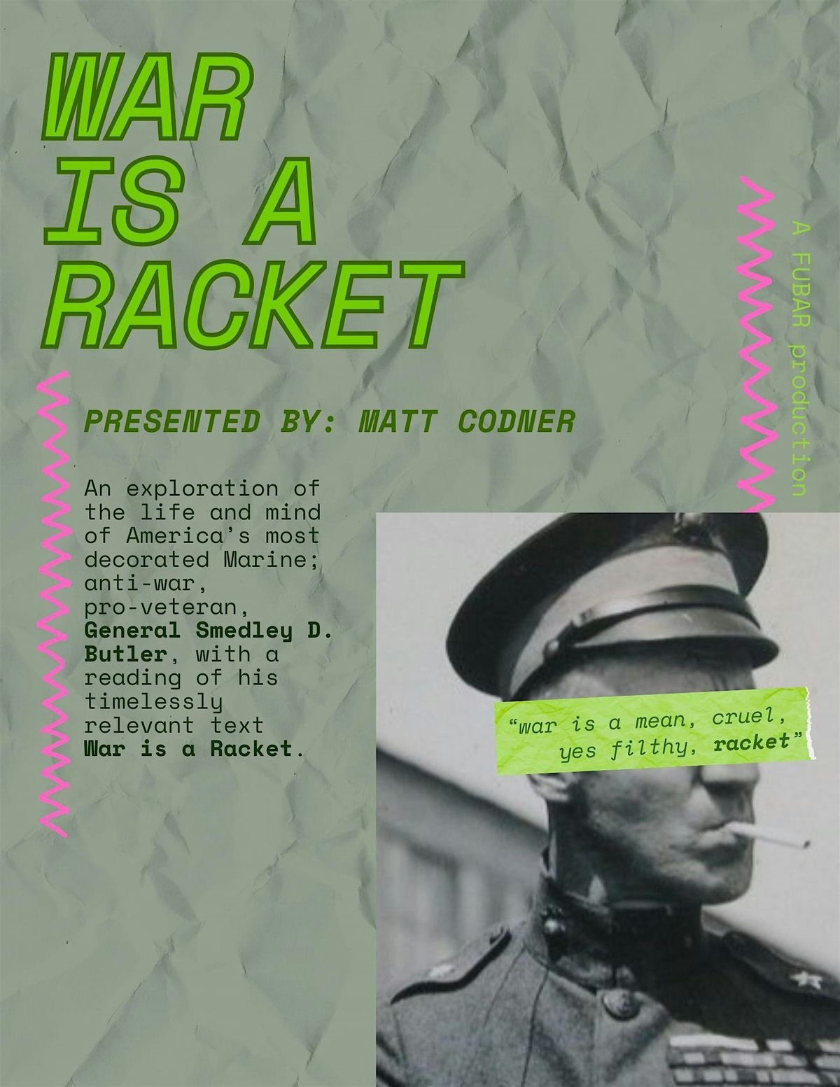 War is a Racket—an exploration into the life and mind of America’s most decorated Marine, General Smedley Darlington Butler, featuring a reading of his timeless speech and a look at the present state of America’s wars and rackets.