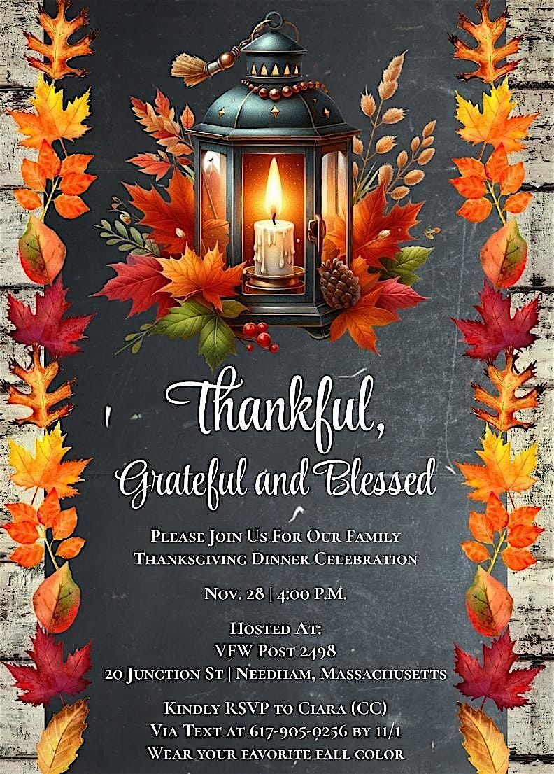 Come join us for a festive Thanksgiving celebration at VFW Post 2498 - 20 Junction St, Needham MA! Get ready for a day filled with delicious food, fun activities, and great company.