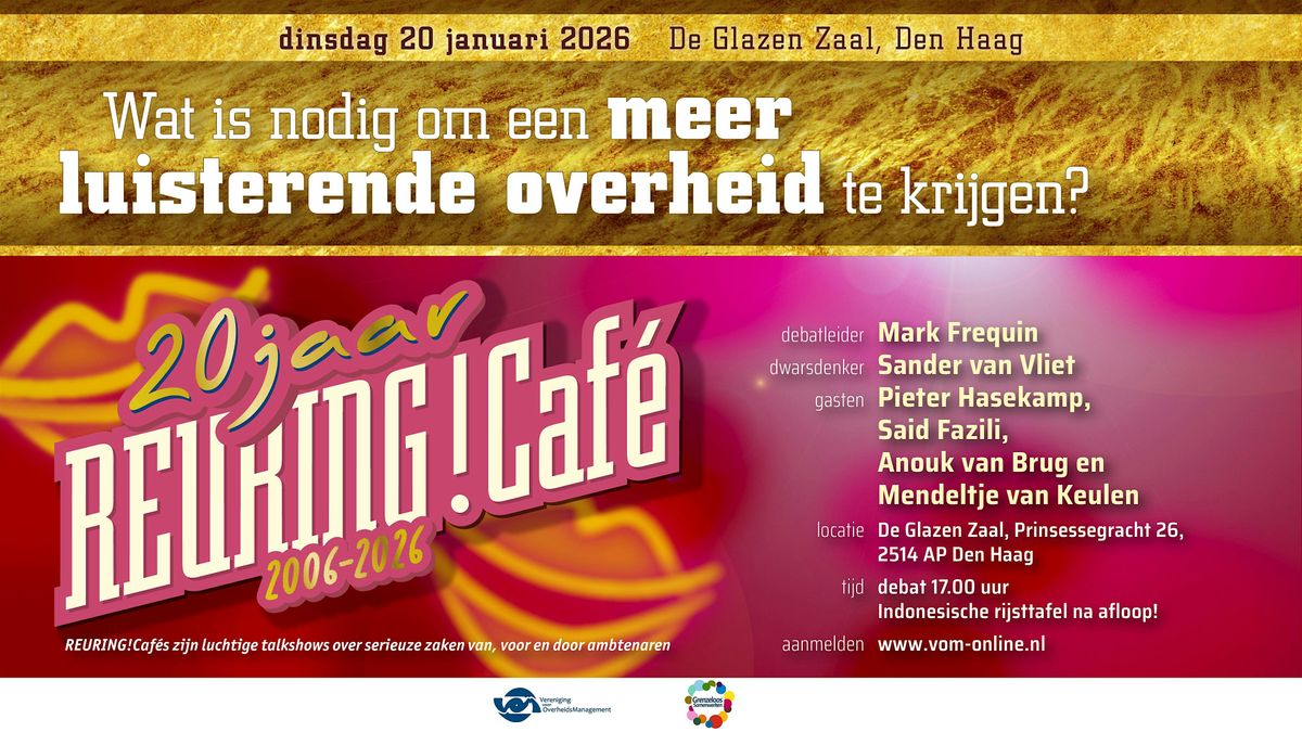 Reuring!Café richt zich op het informeel samenbrengen van ambtenaren, betrokken burgers, mensen uit het bedrijfsleven en maatschappelijke organisaties. Tijdens deze editie pakken we uit met een mooie entourage, een goede borrel en aansluitend een heerlijke Indische rijsttafel. Ook ditmaal verzorgt de huisband van het Ministerie van Algemene Zaken, de ‘Wizards of AZ’ de muziek. Mark Frequin, bestuurslid van de VOM, is onze debatleider. Host van de avond is Ellen Viergever, programmaleider Ambtelijk Vakmanschap/ Grenzeloos Samenwerken.