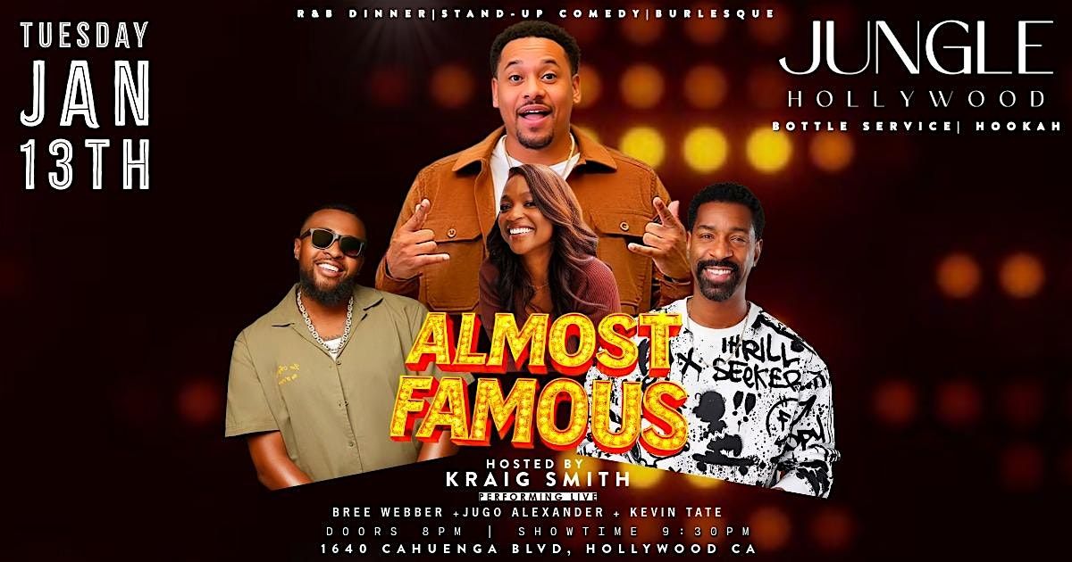 Welcome to the Almost Famous Comedy Show at Jungle Hollywood! Get ready for a night filled with hilarious standup and improv comedy. Join us on January 13, 2026 at 8:00 PM (Pacific Time) for a laughter-packed evening you won't forget. Bring your friends and family for a great time together. See you there!