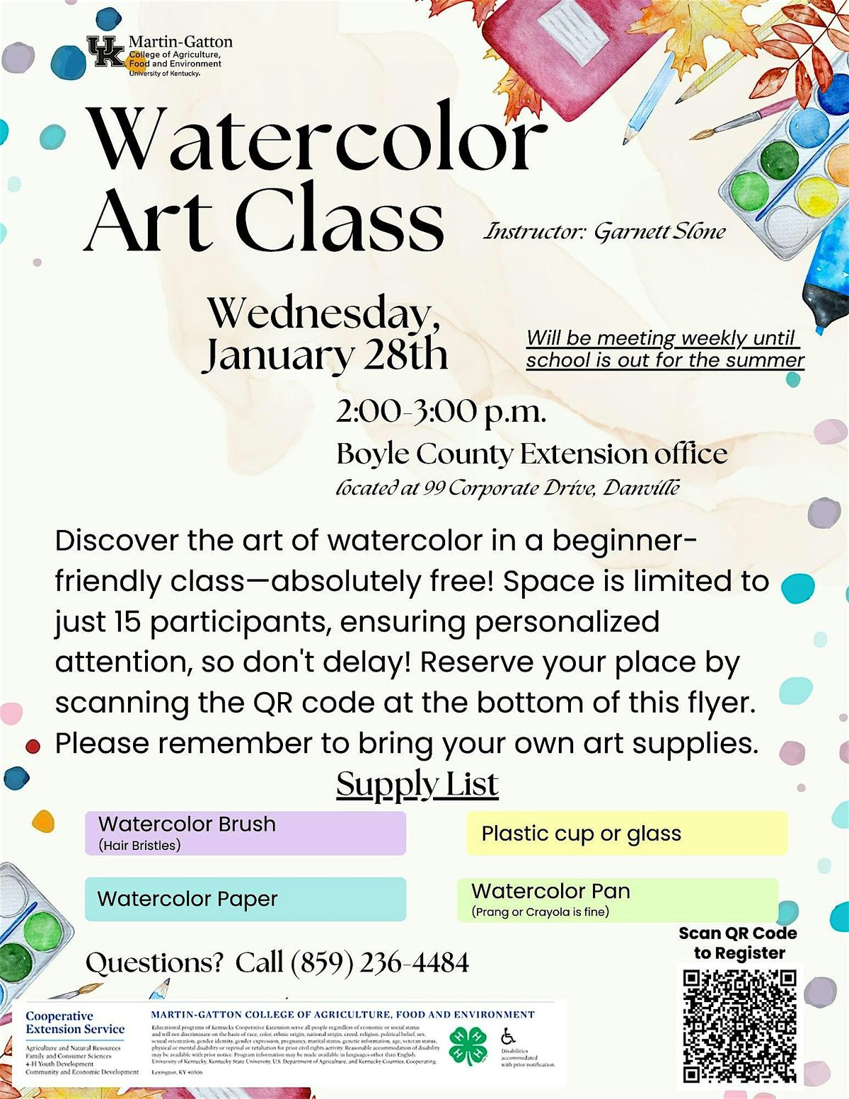 Discover the art of watercolor in a beginner-friendly class—absolutely free! Space is limited to just 15 participants, ensuring personalized attention, so don't delay! Instead of a single session, this will be a weekly series where each lesson builds upon the last. To accommodate this new schedule, each class will run for one hour. Reserve your place by scanning the QR code at the bottom of this flyer. Please remember to bring your own art supplies.