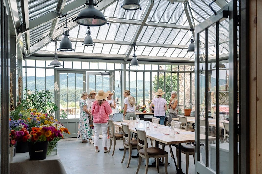 Enjoy a glass of Pippin sparkling wine and a shared charcuterie board as you create in our light-filled Greenhouse, overlooking the Blue Ridge.